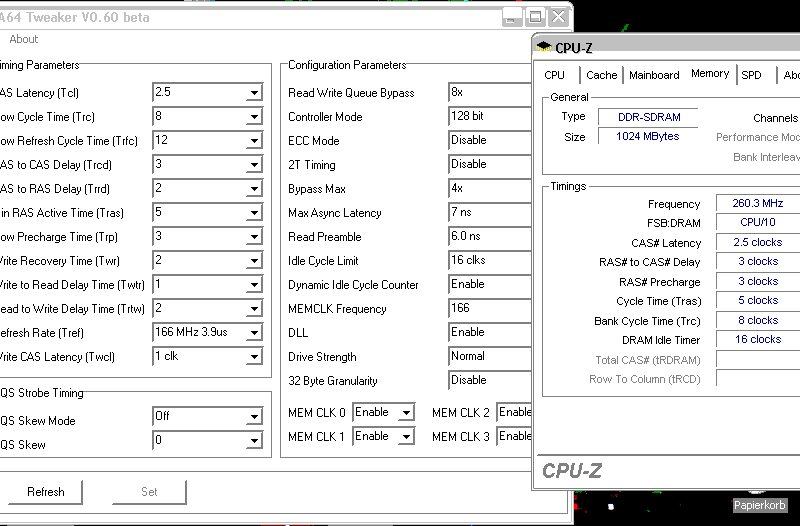 Die Trtw musste ich leider mit em A64 Tweaker auf 2 stellen, da das ABIT BIOS die Einstellung einfach nicht übernimmt und auf 4 belässt, egal was man einstellt. :( Feintuning kommt noch, wenn das System wieder im Case ist und unter der WaKü hängt.