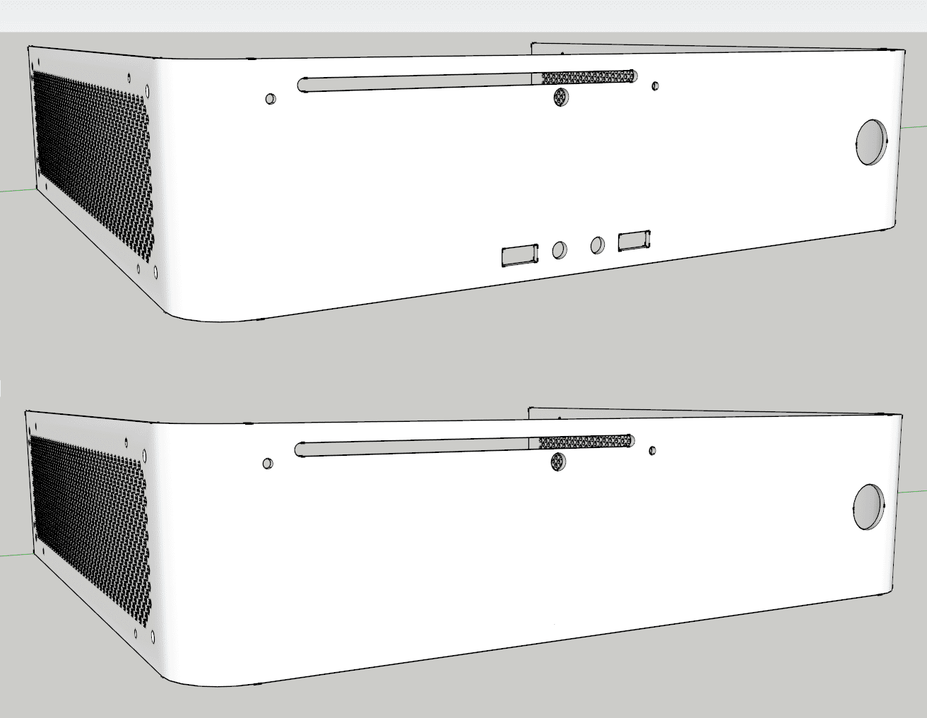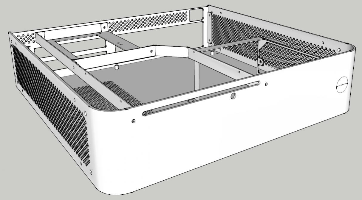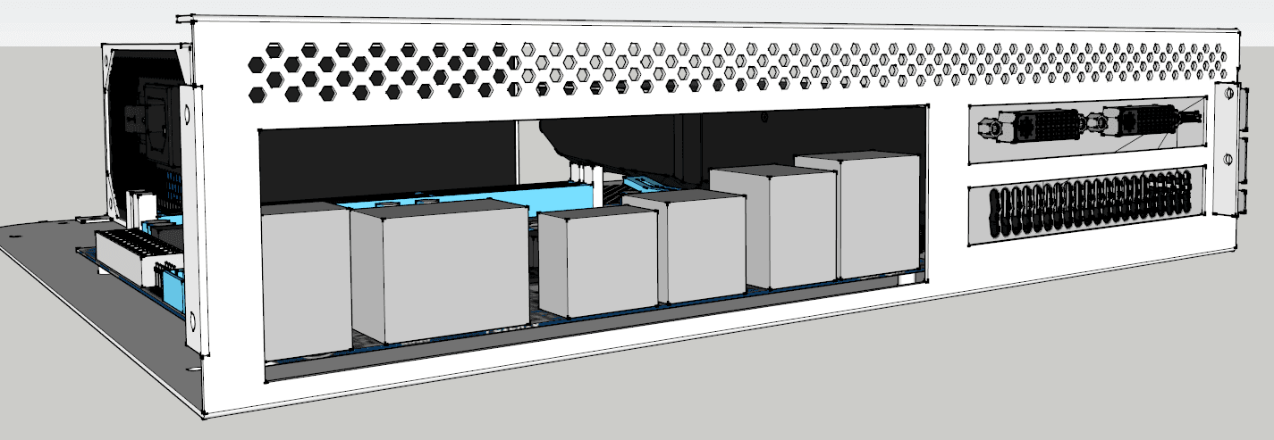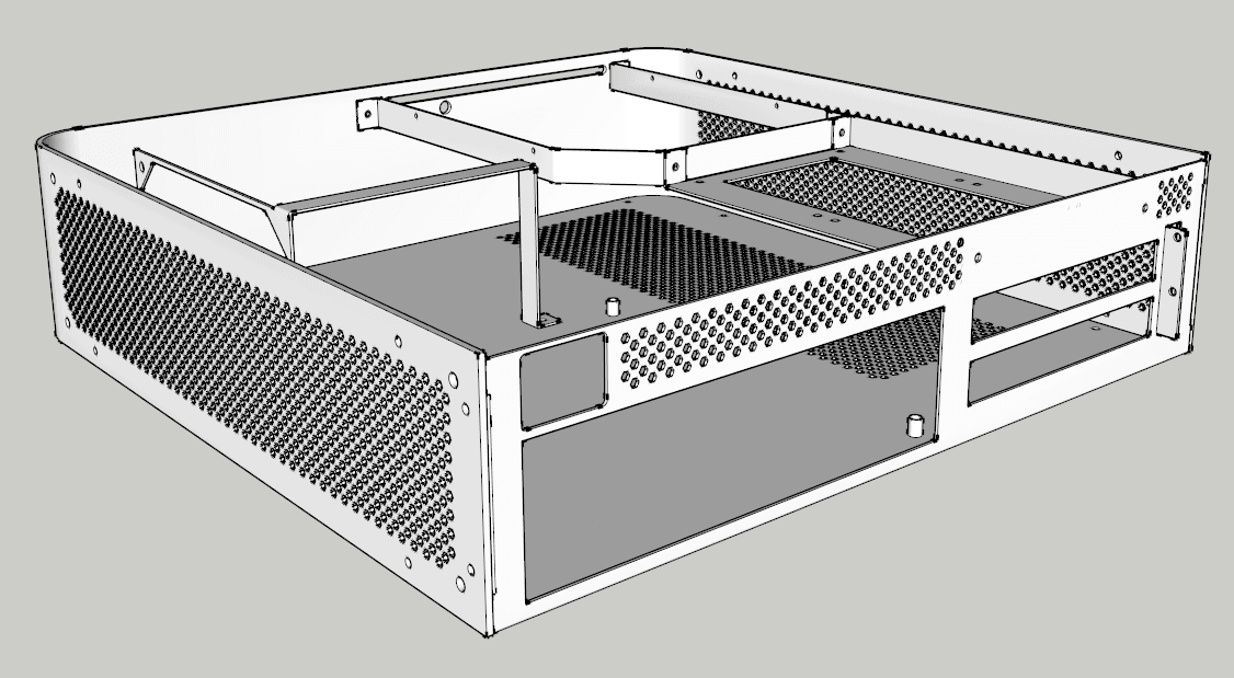Nachdem es nun lange Zeit nichts neues gab, gibt es nun ein Update. Ich habe über 20 Anfragen an Metallverarbeitungsfirmen gestellt. Insgesamt habe ich ca. 18 Absagen bekommen. Zwei Firmen konnten das Gehäuse für einen Preis von um die 700€ bauen. Das war mir zu viel. Daher habe ich das Konzept neu überarbeitet. Das neue Gehäuse besteht aus Scheiben die mit Gewindestangen und im Klipverfahren verbunden werden. Dardruch spare ich mir ein teures Abkanntverfahren. Außerdem konnte ich die über 1500 Lüftungslöcher einsparen, da das Gehäuse oben unten und nach hinten offen ist.
