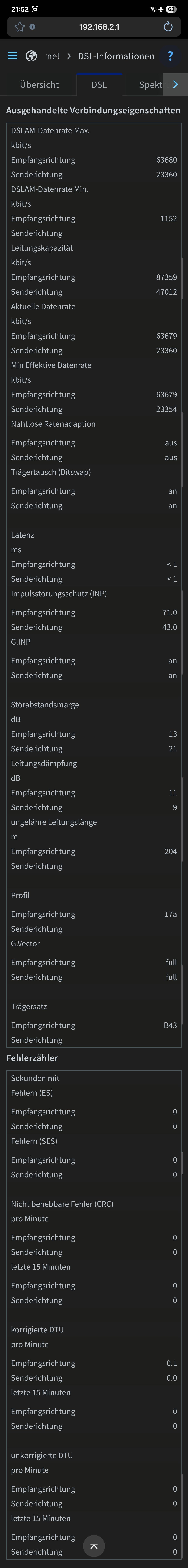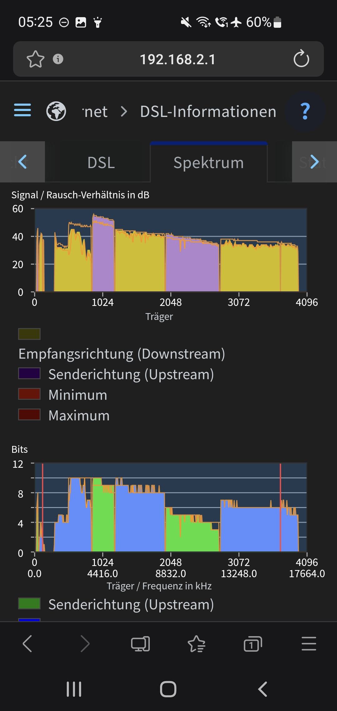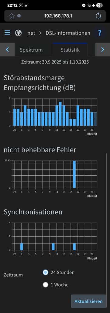 Nach dem Resync waren die Werte wieder fast auf normal-niveau, aber diese sind dann wieder langsam gefallen bis ich Abends bei einem SNR von 13 und in der Früh von 11 war.