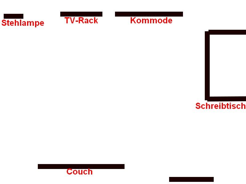 2) Lautsprecher vorne links zwischen Lampe und TV, vorne Rechts ganz ins Eck in die rechte Ecke