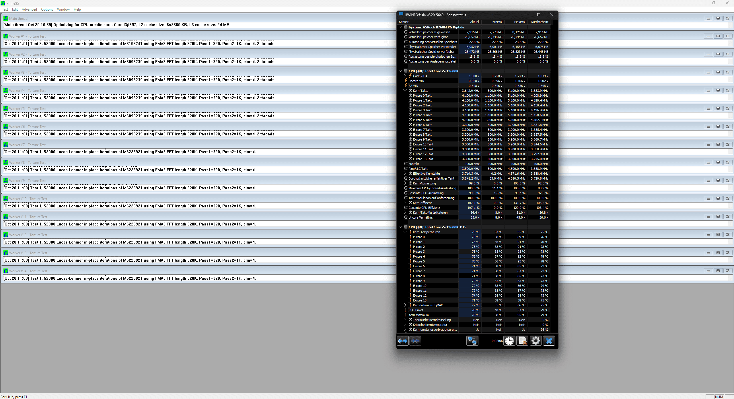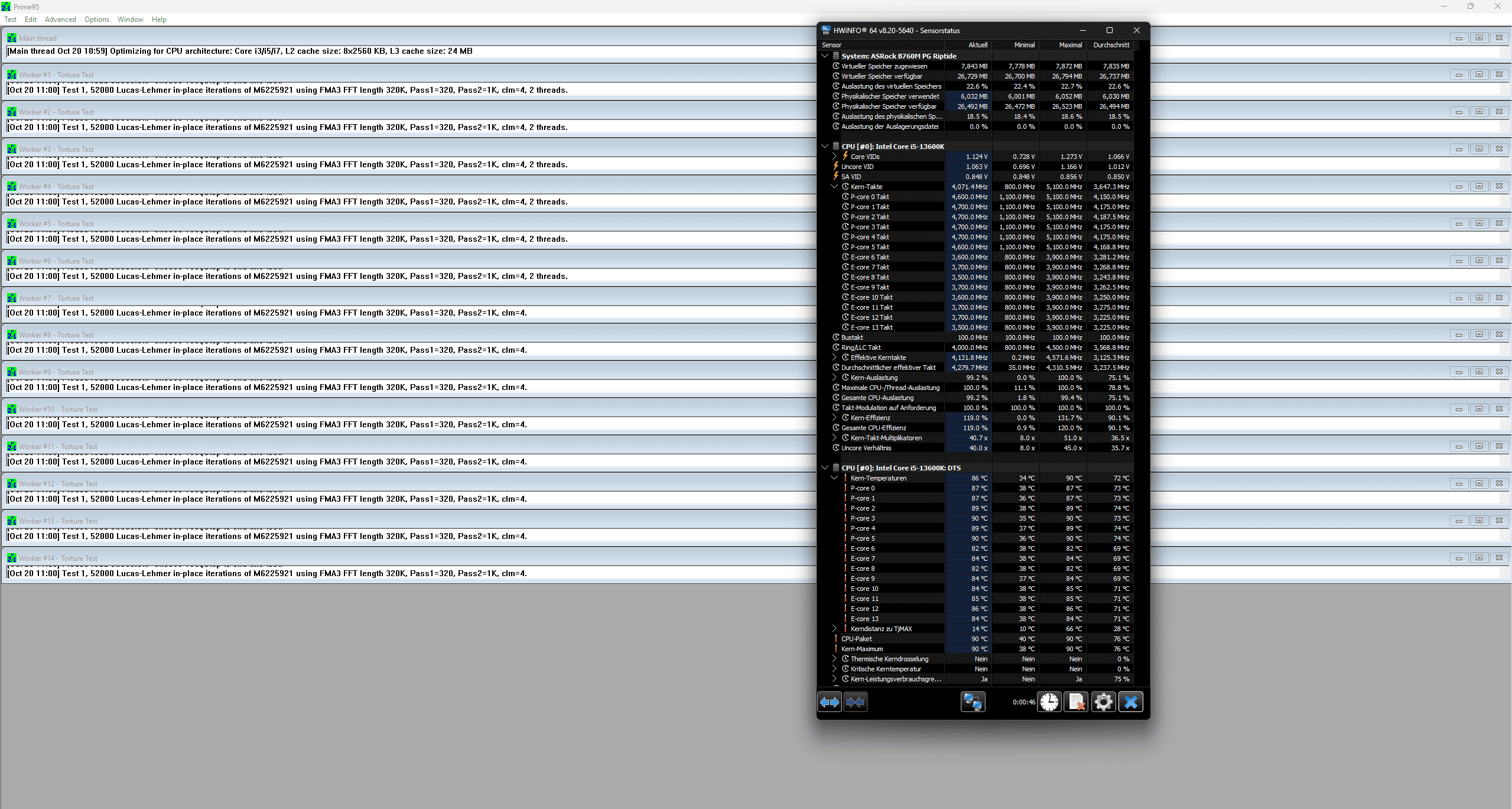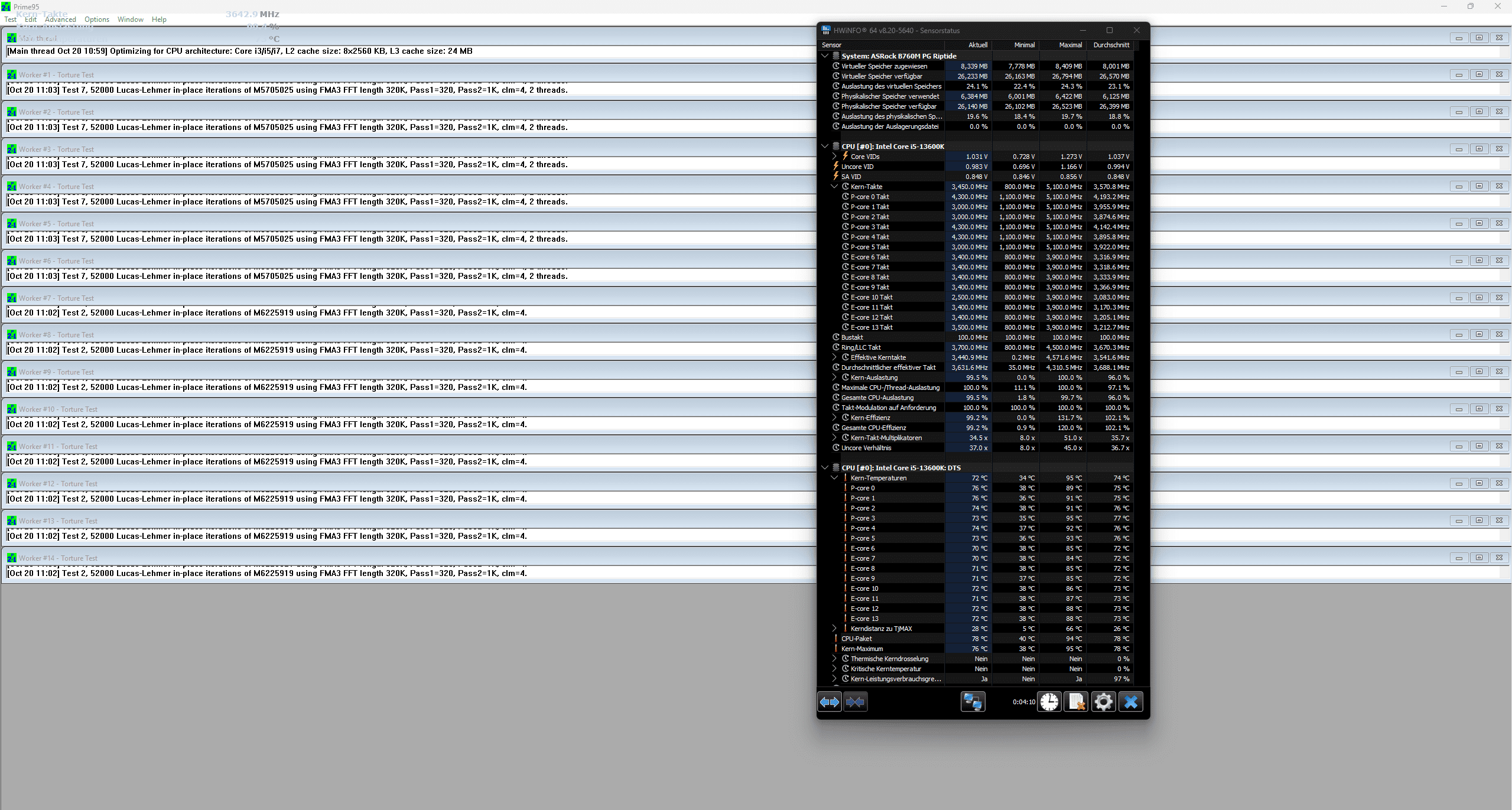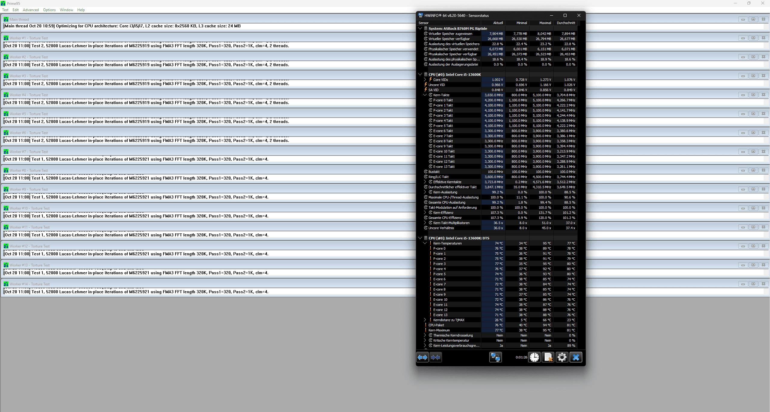 Unter Prime95 mit mehreren Durchgängen zeigte sich folgendes Bild: