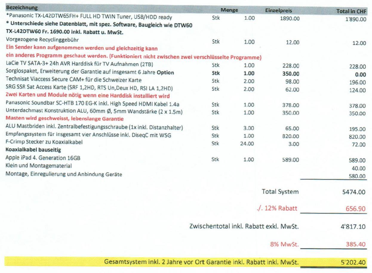 Hinweis: Wenn es irgendwo ein paar Franken günstiger sein könnte, mag das sein - mein Vater (der Käufer) hat aber geschäftliche Beziehungen zum Verkäufer und darum wird da jeweils nicht so ganz genau geschaut. Wenn jetzt einer sagt, man könnte das auch zum halben Preis haben, dann müssten wir aber natürlich nochmals über die Bücher.