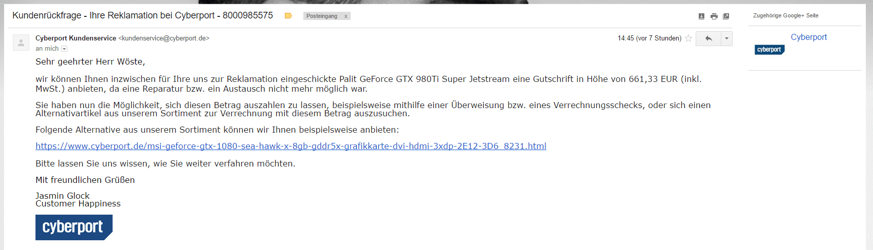 Da meine 980 Ti den Geist aufgegeben hat, erhalte ich eine Rückzahlung über ~660€.