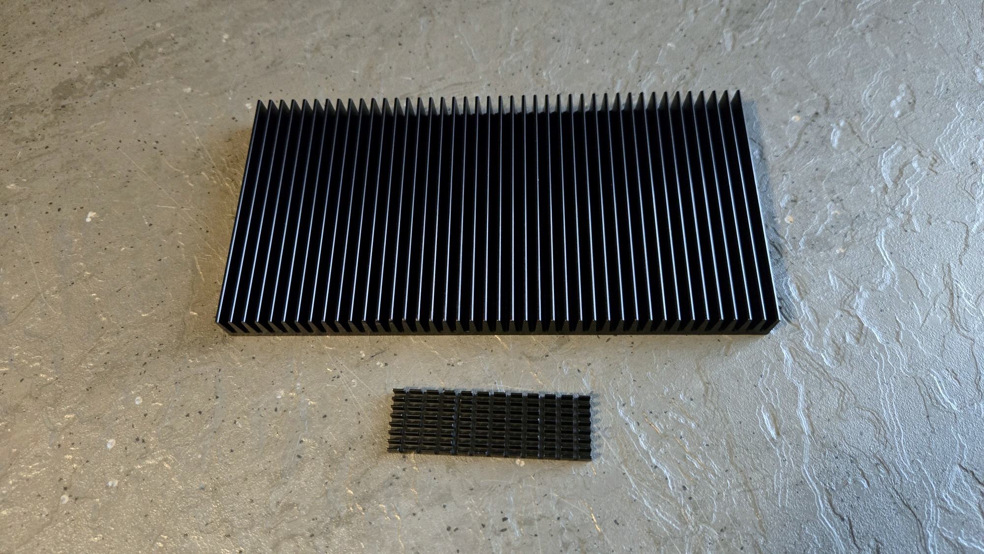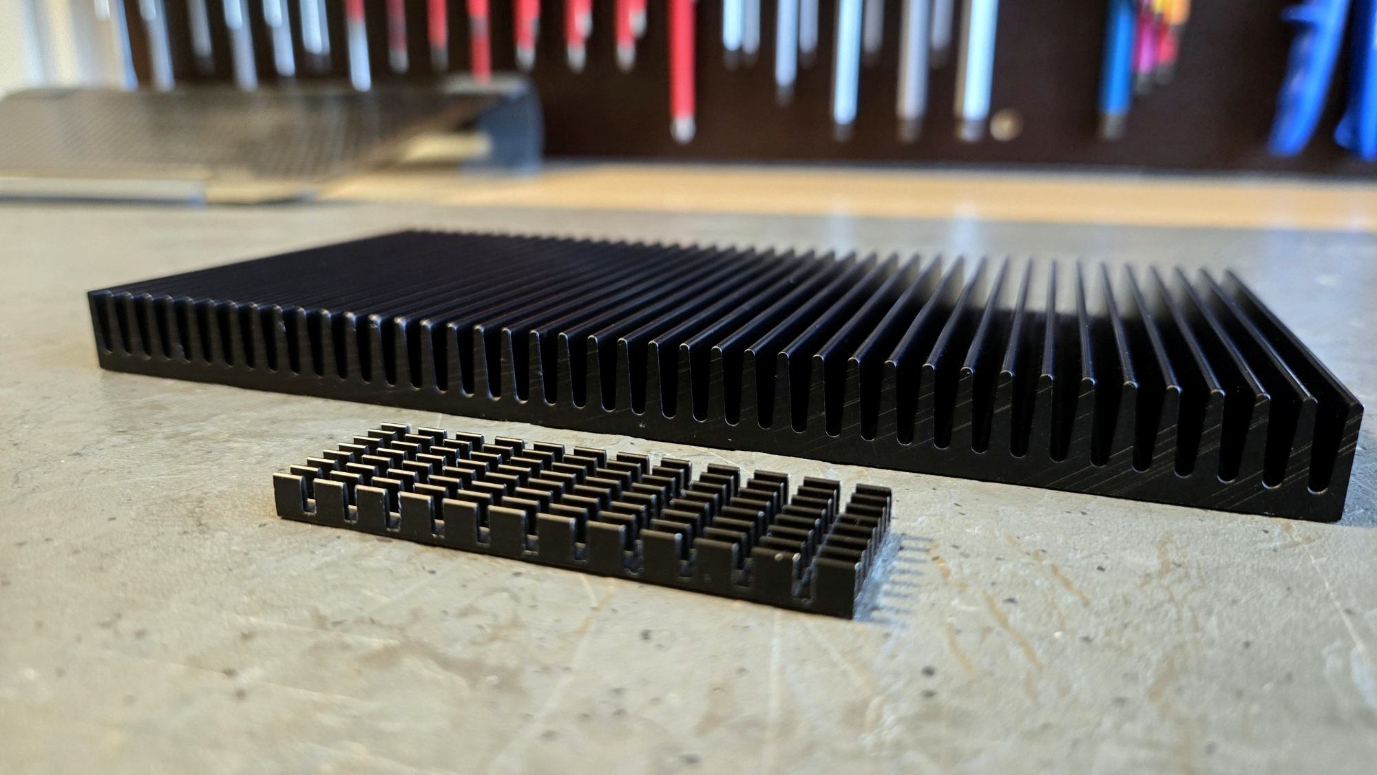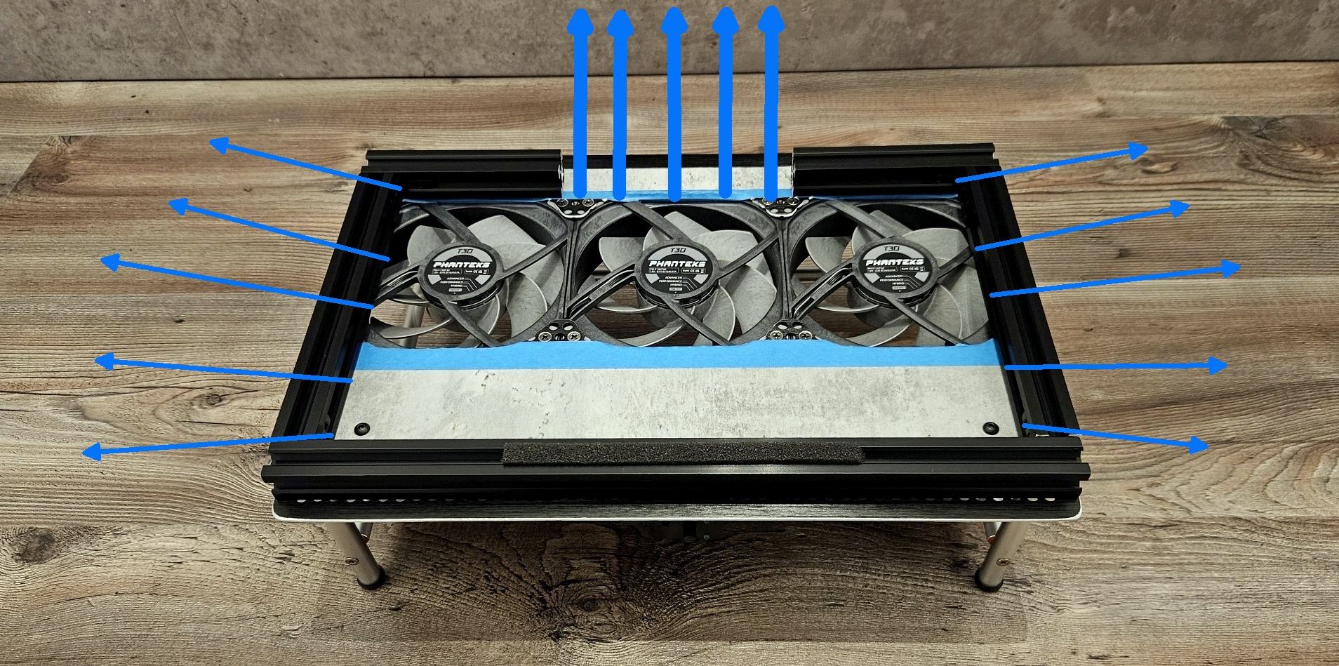 Der Kühlkörper ist so designt, dass er die optimale Kühlleistung entfaltet, wenn die Frischluft längs an den Kühlfinnen lang strömt. Zwar habe ich meinen T30-Kühler so umgebaut, dass die Luft größtenteils hinten herausströmt, aber überwiegend trifft die Frischluft von den T30-Lüftern vertikal auf die Kühlfinnen und geht erst dann längs weg. Daher habe ich überlegt, zusätzliche Lüfter vor den Kühlkörper zu montieren, die den Luftstrom besser entlang der Kühlfinnen leitet.