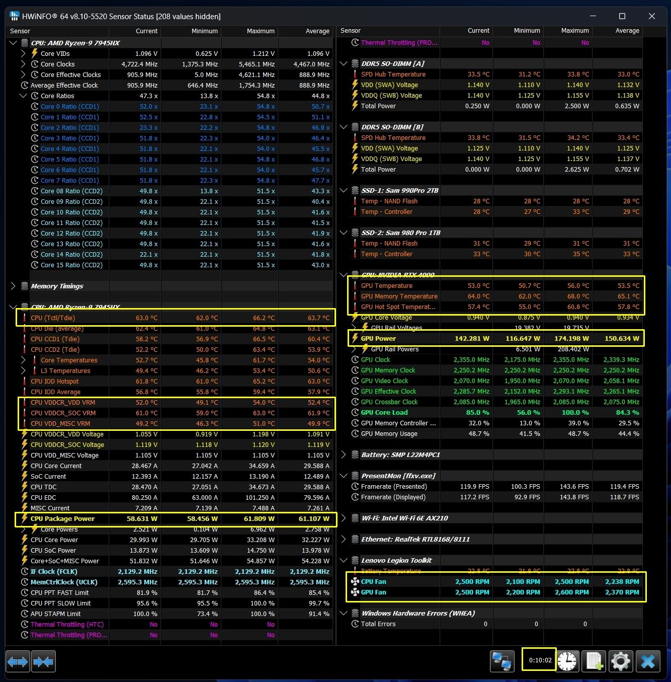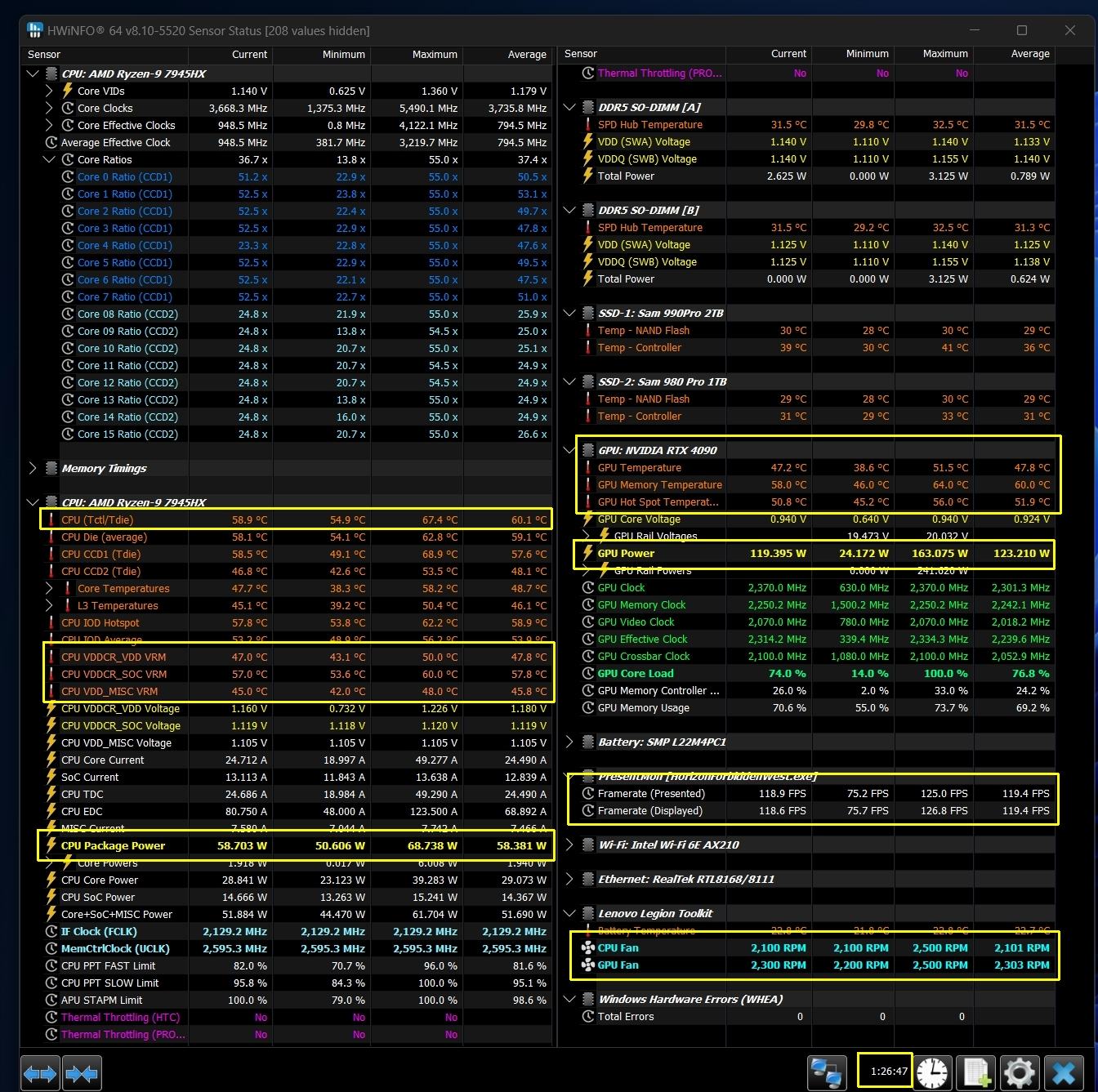 Auf die Gaming-Tests betrachtet, schwankt die Last natürlich ein wenig, weil es davon abhängt, wie oft und wie lange ich mich in irgendwelchen Menüs, Shops usw. aufhalte (wo wenig GPU-Last ist) und wo ich mich auf der Map befinde. Während sich die CPU Power durch mein eingestelltes Powerlimit meist um die ~57w einpendelt, schwankt die GPU Power meist um die 115-130w, was aber nur einen marginalen Einfluss auf die Temperaturen hat. Wichtiger ist, dass das FPS-Ziel von 120 FPS in jeder Situation gehalten wird. (Die Min-Werte bei FPS im HWinfo-Log kommen von Wechseln in Menüs oder Schnellreise auf der Map).