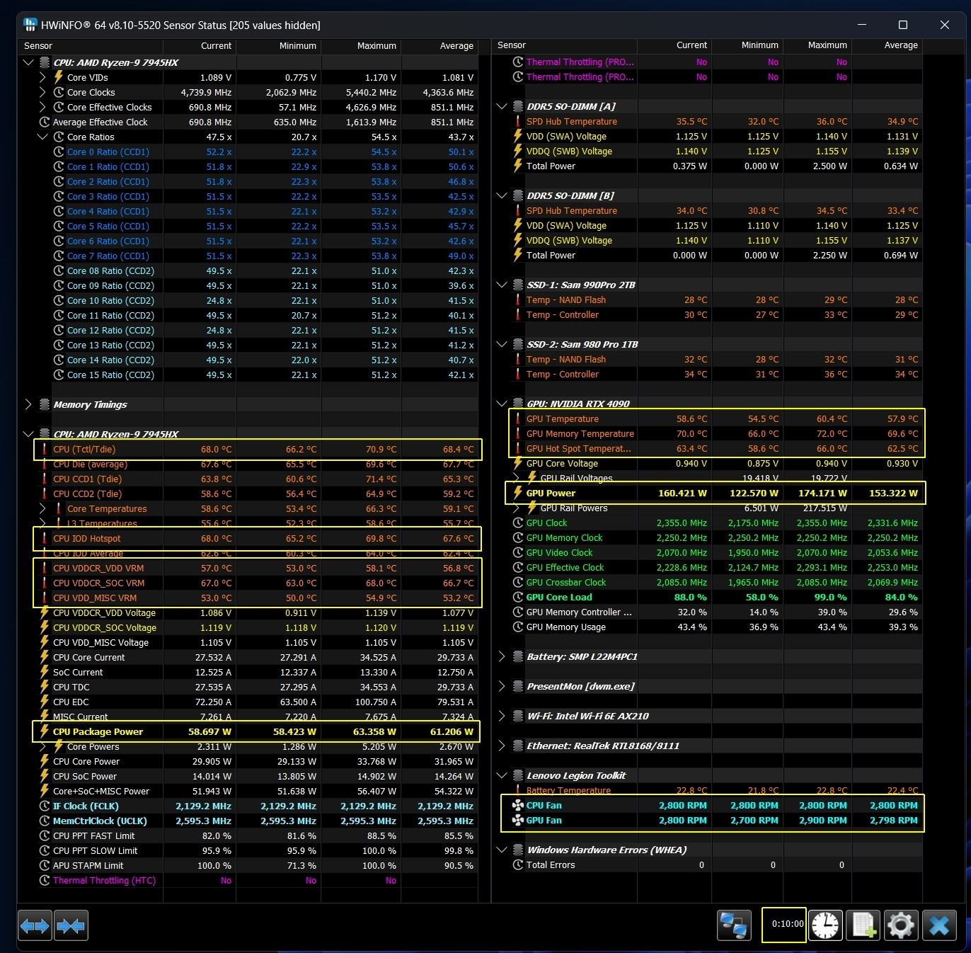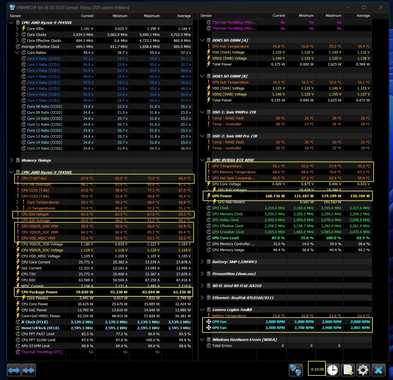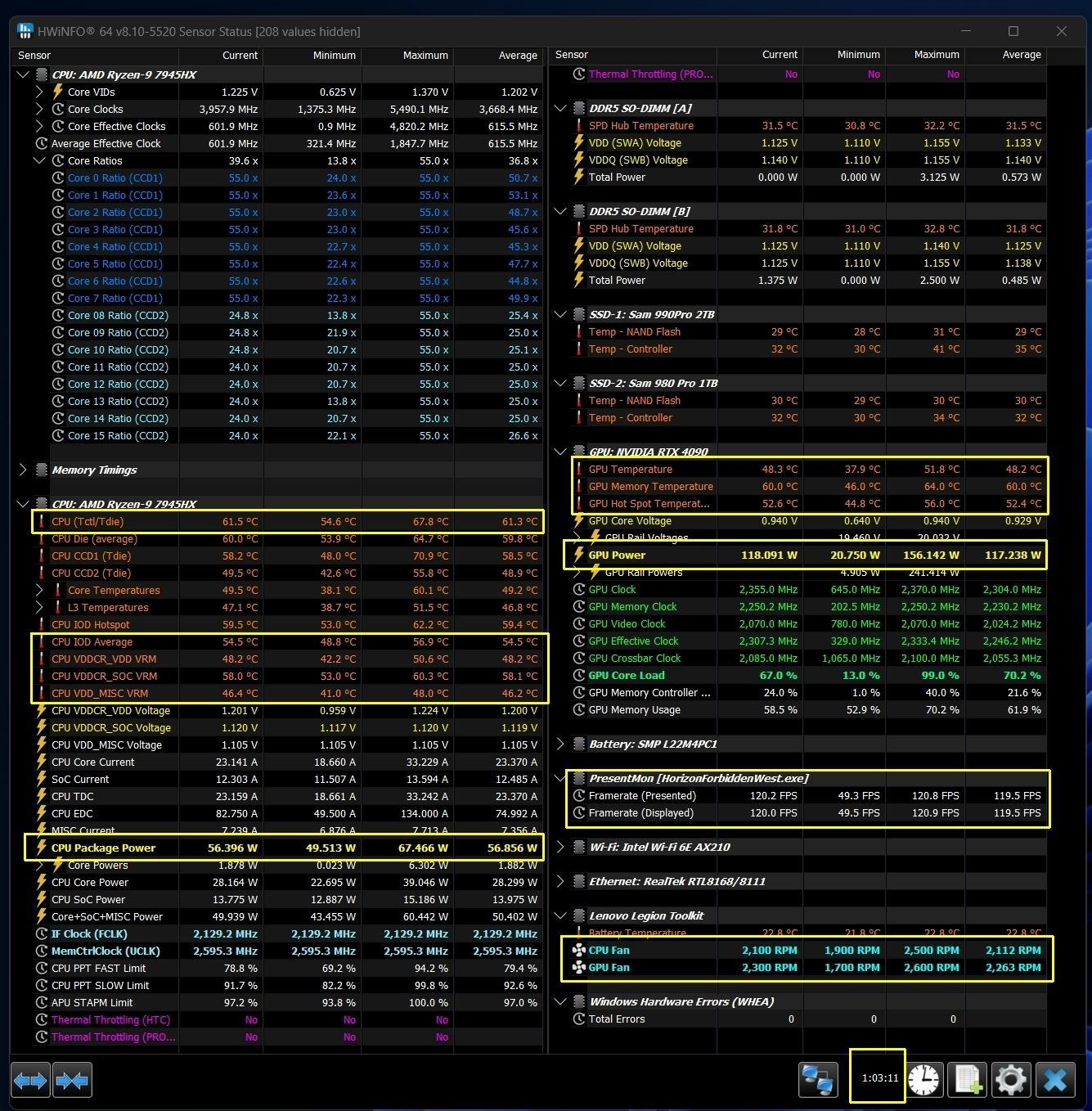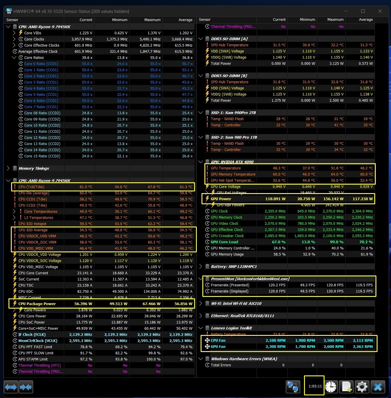 Im Gaming-Betrieb, in dem Fall mit Horizon Forbidden West, sind die Temperaturen auch lächerlich niedrig, zumindest für ein Notebook dieser Leistungsklasse. Leise 2500 rpm können nun problemlos dauerhaft gehalten werden. Habe es jetzt mehrfach (Test 1., 2., 3.) über mehrere Stunden/ Gaming-Sessions erfolgreich getestet.