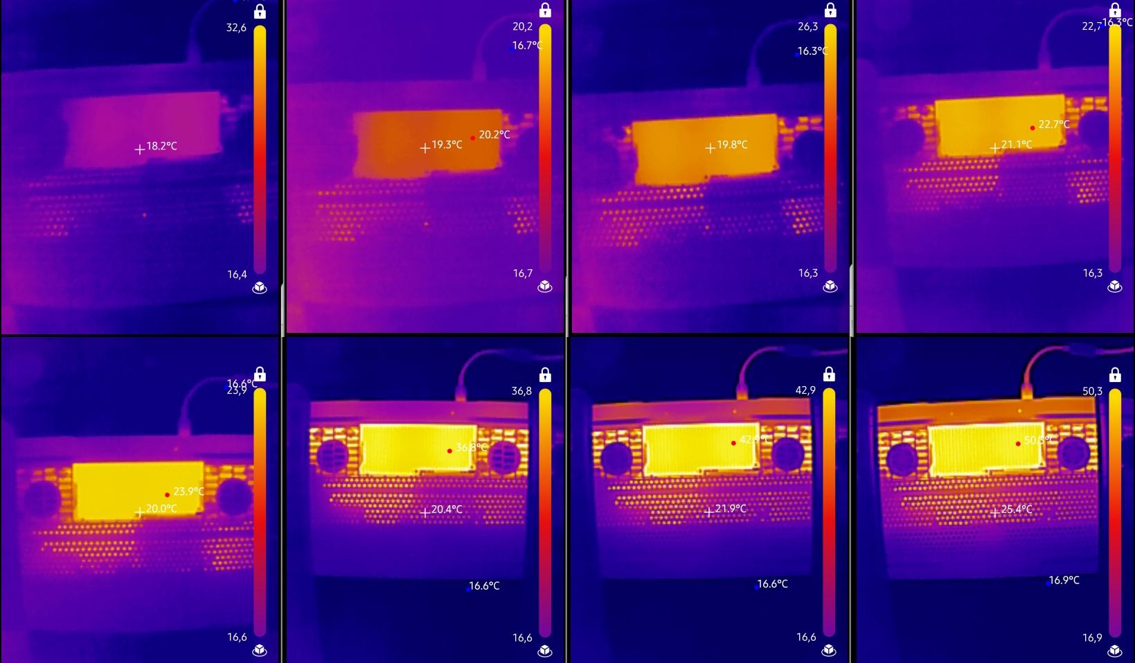 Mit diesen beiden Tests wollte ich prüfen, was die kleinen Lüfter alleine, (fast) ohne T30-Kühler, reißen können. Das Ergebnis hat mich dann doch etwas erstaunt. Auf 45% Lüfter-Leistung schaffen es die kleinen Lüfter fast den großen T30-Kühler einzuholen, wobei man hier fairerweise die 2800 rpm der Legion-Lüfter anmerken muss. Beim Test mit dem T30-Kühler waren es 300 rpm weniger/ 2500 rpm. Dennoch, kein schlechtes Ergebnis für die kleinen Lüfter. Im Test 6. habe ich statt den 100% Lüfter-Leistung lieber 85% Lüfter-Leistung verwendet, weil die Lüfter dann kein zusätzliches Vibrationsgeräusch erzeugen (vermutlich muss man sie dafür festschrauben). Auch hier wollte ich nur schauen, was maximal möglich ist. Geräusch-technisch ist es sehr ähnlich wie das Legion auf 100% (5100 rpm). Auch wenn die kleinen Lüfter im Test 6. den T30-Kühler geringfügig geschlagen haben, ist der T30 um Welten dabei leiser und kühlt das gesamte Legion inkl. RAM, SSD, Board etc. Außerdem kann man die T30-Lüfter auch für 3000 rpm freischalten, allerdings habe ich dann ein wenig Bedenken, ob die Legion-Lüfter/ Lager das auf Dauer überleben. Deshalb nutze ich den T30-Kühler nur bis max. 2000 rpm.