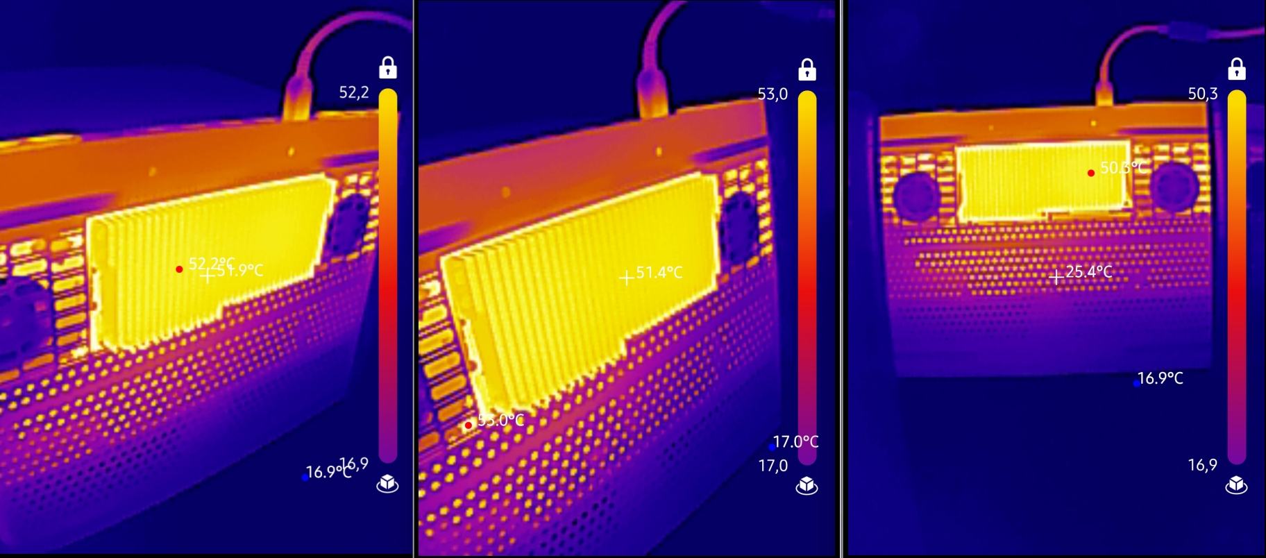 Der für mich wichtigste Vergleich war der Test 2. mit Test 3. Ausgehend ist hier der Geräuschpegel von den 2500 rpm der Legion Lüfter. Die T30-Lüfter auf 2000 rpm sind hier ähnlich laut und deshalb habe ich die (ich nenn sie mal) Turbofans bis ca. 45% Leistung aufgedreht. Eine Verbesserung ist messbar, aber von ca. -2,5°C auf CPU und GPU nicht sonderlich hoch. Mit Test 3. wollte ich einfach nur prüfen, was die kleinen Lüfter maximal herausholen können, auch wenn es Lautstärke-technisch überhaupt keinen Sinn macht. Für dreimal so laute Lüfter gab's eine Verbesserung von mickrigen ~ 1-1,5°C = Lohnt mal überhaupt nicht, trotz dessen, dass die kleinen Dinger verdammt viel Luft bewegen.