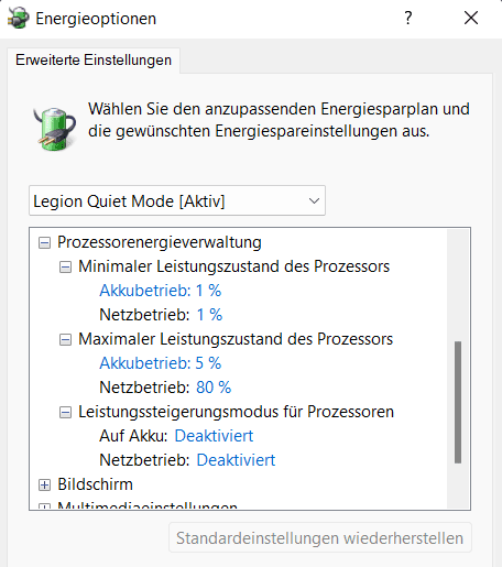 Für alle, die die Vantage-Software nicht mögen oder zu überladen/ unübersichtlich finden, gibt es auch eine gute Alternative, die wirklich nur auf das Minimum beschränkt ist. Die Software nennt sich "Lenovo Legion Toolkit" (Download) und bietet alle wichtigen Funktionen, die auch die Vantage-Software zur Verfügung stellt, nur halt ohne den ganzen Schnickschnack. Zu finden im Unterpunkt 4.2 Legion Toolkit.