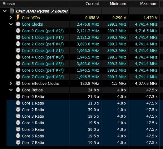 Im normalen Anwendungsbereich, also bei mir Office, Forum, nebenbei YT-Music, broswing, Email, etc. macht der 6800U auf allen Kernen 4.750 MHz (Single-Boost)