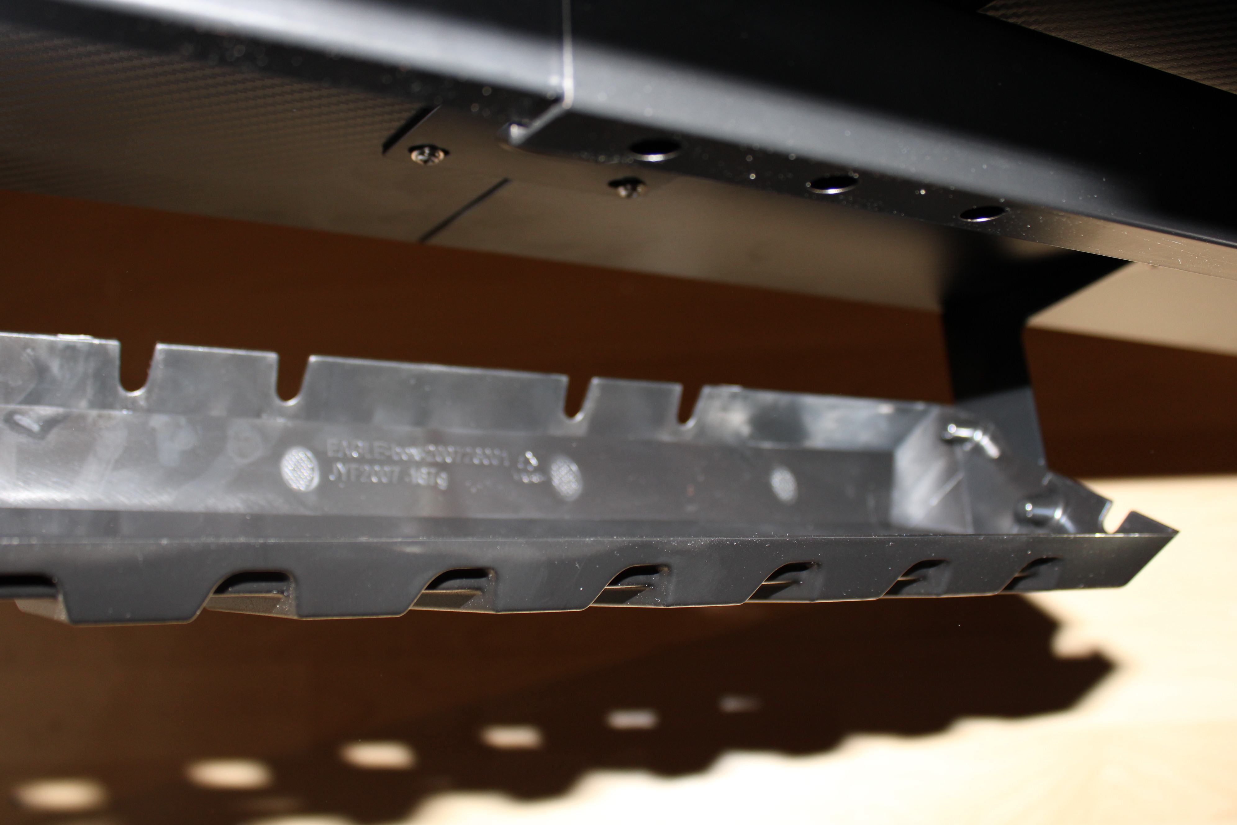 Für das Kabelmanagement besitzt die Tischplatte 2 Durchführungen und auf der Unterseite eine Ablage, auf dieser