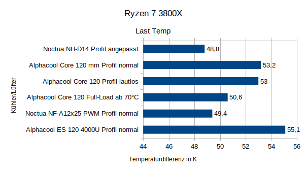 Wie man unschwer erkennen kann, liegen die Temperaturen im lastfreien Zustand im grünen Bereich. Überraschend ist lediglich, dass alle eingesetzten Lüfter auf der AIO bei geringerer Lautstärke besser kühlen, als der NH-D14. Unter Last haben wir dagegen ein anderes Bild. Hier kann die AIO nur mit dem ES 120 4000 Lüfter aufschließen, denn es tritt zusätzlich eine Schwierigkeit ein: Der Ryzen 7 3800X reduziert ab 75°C Kerntemperatur seinen maximalen Takt. So liegen dauerhaft beim Noctua NH-D14 und dem ES 120 4000 ganze 4,2 GHz AllCore-Takt an. Der NH-D14 schafft es aber auch nur gerade so mit 72,9 °C darunter zu bleiben. Selbst nach einer Stunde Volllast erhöhte sich diese Temperatur nicht. Der Standardlüfter der Core Ocean T38 schafft es dagegen selbst mit maximaler Drehzahl nicht, unter dieser Grenze zu bleiben, was letztlich in einem AllCore-Takt von nur noch 4,1 GHz mündet. Es kommt also bereits bei dieser CPU mit dem beiliegendem Lüfter zu Leistungseinbußen trotz einer Lautstärke von störenden 52,8 dB(A).