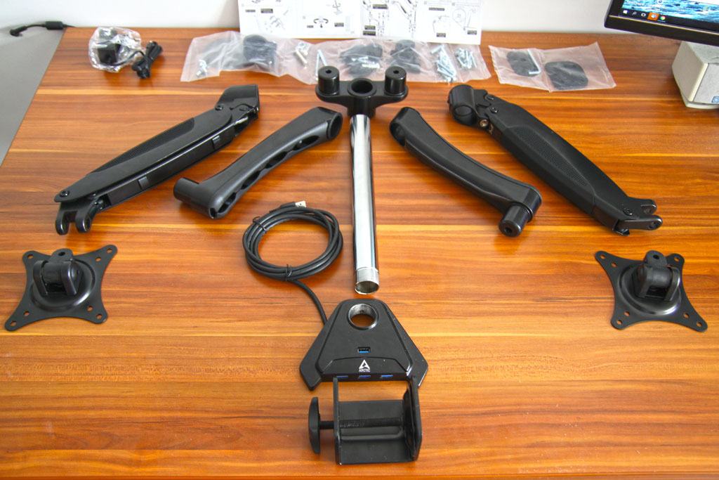 Im Lieferumfang ist neben dem eigentlichen Monitorarm noch eine bebilderte Beschreibung und das Netzteil für den USB3-Hub.