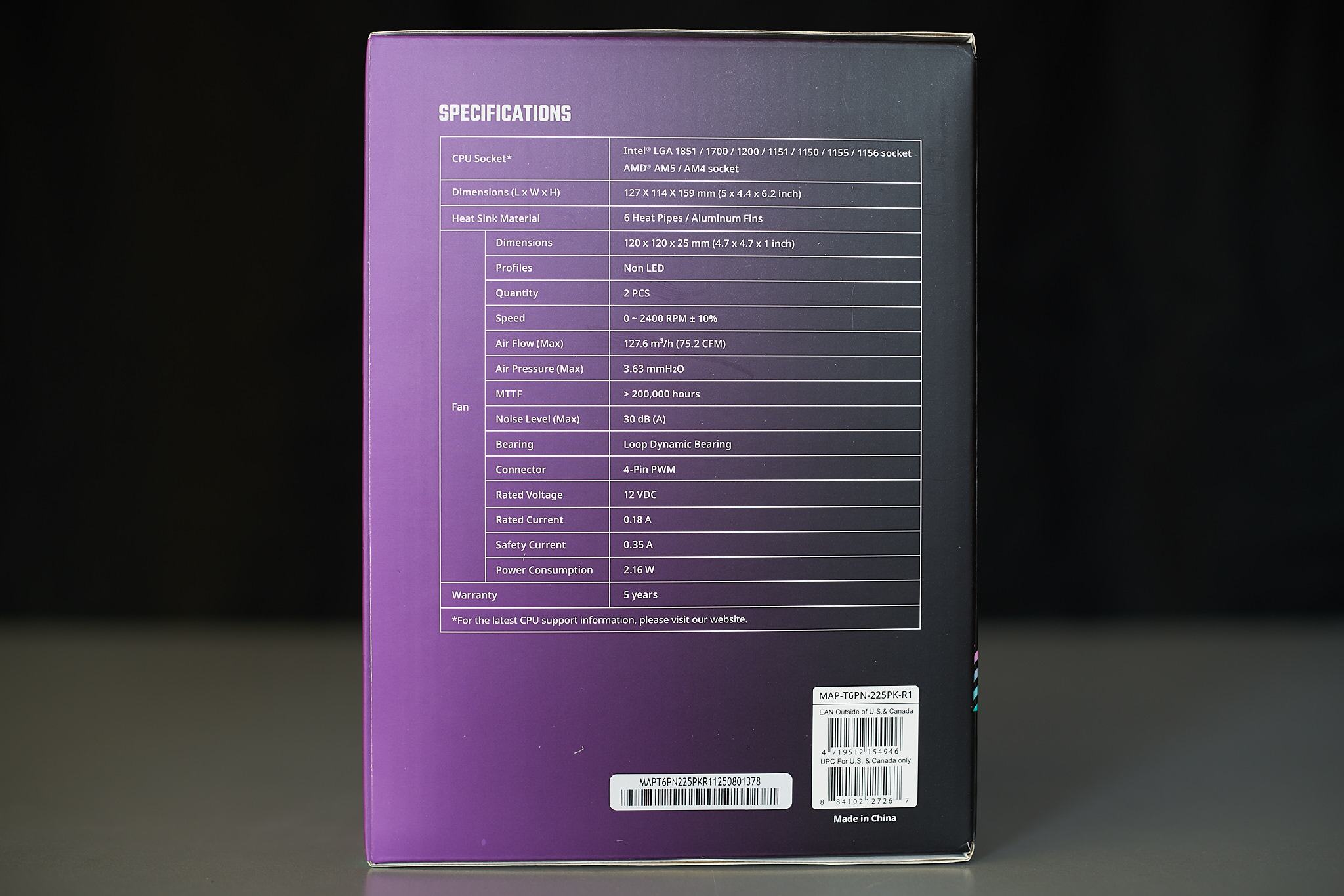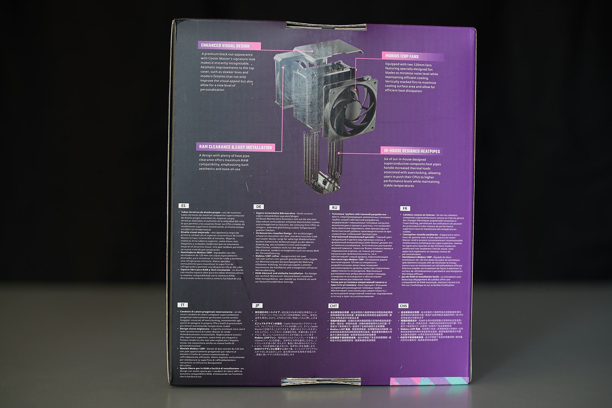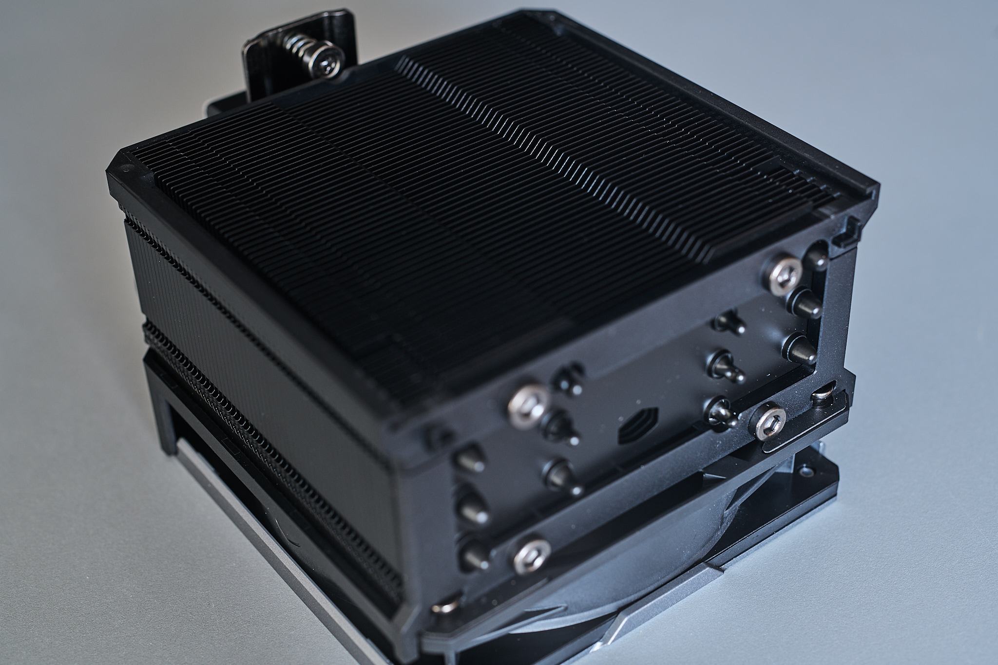 Den Kühler selbst würde ich weitestgehend als schwarze "Box" mit silbernen Akzenten an den Stirnflächen beschreiben. Die außenliegenden Seiten der Lüfter samt den eher unansehnlichen Schraubenlöchern der Lüfter werden von je einer Zierblende versteckt, die dem Kühler mehr den Eindruck geben aus einer Einheit zu bestehen. An der Oberseite gibt es eine magnetische befestigte Blende die Heatpipeenden im Kühlkörper und die Einhängung beider Lüfter verdeckt. Das Lamellenpaket ist in Richtung der Gehäuserückseite verschoben um bessere Kompatibilität mit hohen RAM-Modulen zu gewährleisten. Damit der hintere Lüfter nicht mit ausladenden VRM-Kühlerkonstruktionen oder Displays auf der I/O Abdeckung kollidiert, kann der Lüfter um einige mm nach oben verschoben werden, auch wenn das in meinen Augen die eigentlich sehr cleane Optik des Kühlers zerstört.