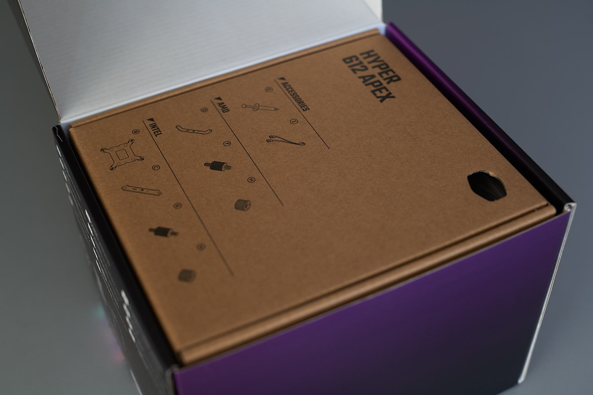 Das Farbschema der Verpackung folgt dem gleichen Typ wie schon bei den Cooler Master Mobius 120P ARGB-Lüftern bzw. generell den Cooler Master Produkten mit überwiegend Schwarz und Lila mit grünen Akzenten. Öffnet man die Box sieht man zuerst eine Schachtel mit dem Zubehör, unter der sich der Kühler, verpackt in einer Plastikfolie, befindet. Das Zubehör für den Kühler besteht aus den Montagematerialen für die AMD Sockel AM4/5 sowie die Intelsockel 115x/1200/1700/1851, eine Anleitung, ein Garantiezettel, eine Tube Cryofuze Wärmeleitpaste, sowie ein y-Kabel, bei dem der Anschluss, von dem die Lüfterdrehzahl ans Mainboard weitergegeben ist, braun hervorgehoben ist. Wie schon bei den Mobius 120P ARGB-Lüftern empfand ich auch hier das Auspacken des Produkts als sehr angenehm und unkompliziert. Kudos an die Personen, die bei Cooler Master die Verpackungen designen.