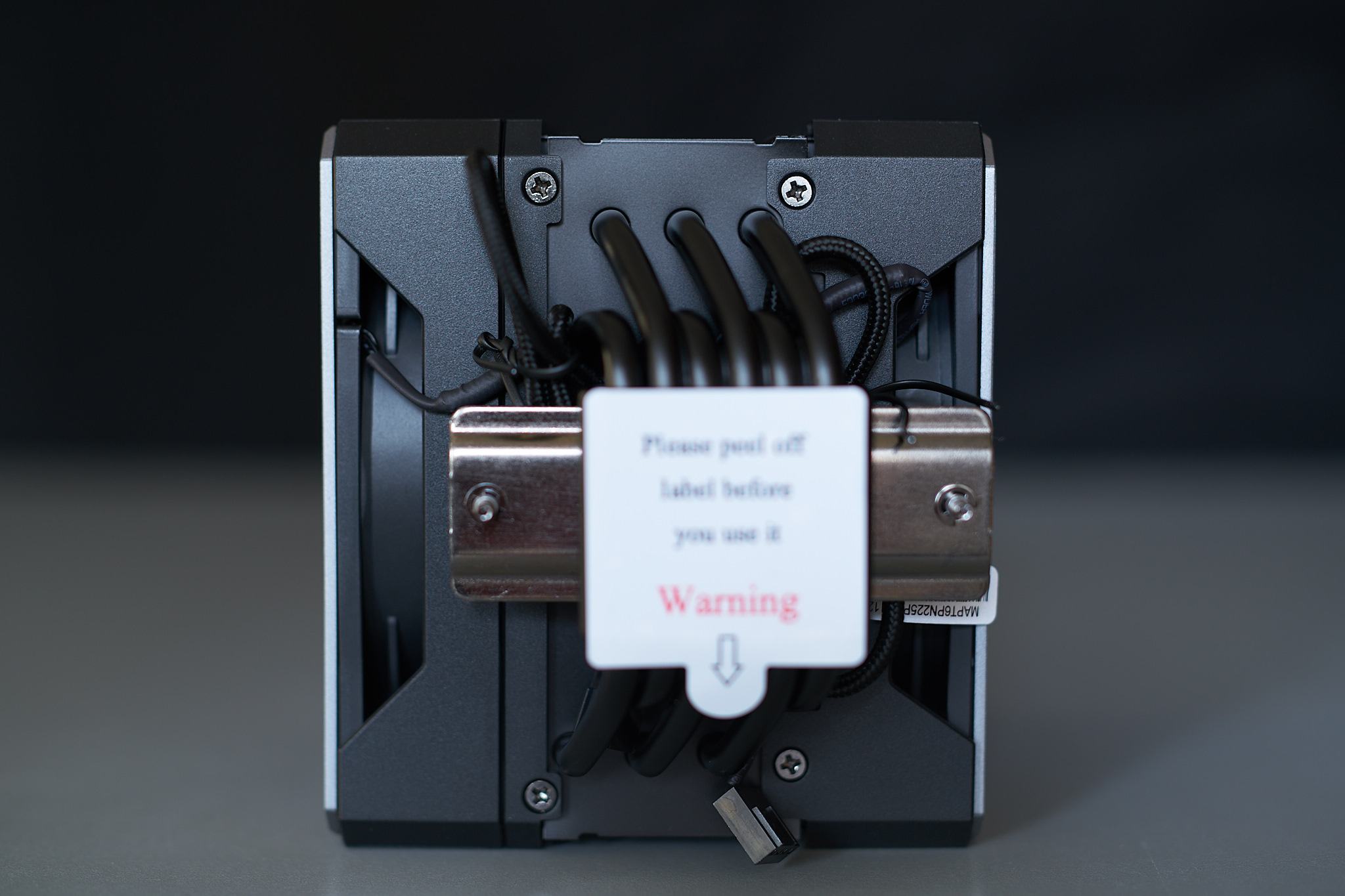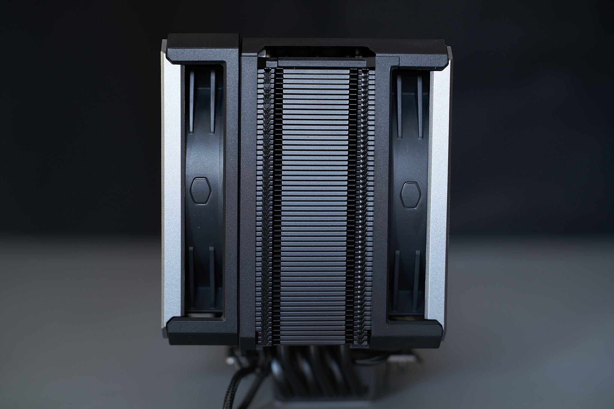 Nimmt man die magnetische Blende von der Kühleroberseite ab sieht man sowohl die Enden der insgesamt sechs Heatpipes als auch ein kleines Loch im Lamellenpaket, das die Form des Cooler Master Logos hat und in meinen Augen keinerlei Funktion hat, außer möglicherweise als Kabelkanal zu dienen, über den man unsichtbar Kabel von der Kühlerbodenplatte zu einer möglichen Beleuchteten Kühlerabdeckung hätte legen können. Nimmt man den Hinteren Lüfter ab fallen die Blechclips auf dem Rahmen auf, an den der Lüfter verschraubt ist und die genutzt werden um den Hinteren Lüfter in festen Rasten verschieben zu können. Der vordere Lüfter wird nur mit zwei Schrauben in Schienen fixiert und unten am Kühler eingehakt. Im Rahmen des späteren Lüftertauschs auf die ARGB-Variante habe ich getestet, inwieweit das Design der Lüfterhalterungen zu Problemen führen könnte, und habe zwar beim hinteren Lüfter keine Probleme gefunden, auch wenn auch hier höchstwahrscheinlich die silberne Zierblende nicht mehr weitergenutzt werden könnte, der vordere Lüfter braucht jedoch einen Rahmen, der von der Form den ursprünglichen Mobius 120P ähnlich genug ist, um am Kühlkörper eingehakt zu werden. z.B. ein Noctua A12x25 und ein Arctic P12 hätten hier nicht gepasst, bei einem Lüftertausch wegen Lüfterdefekt wird man hier höchstwahrscheinlich also auf Cooler Master Lüfter zurückgreifen müssen, was die Ersatzmöglichkeiten deutlich einschränkt, auch wenn Cooler Master 5 Jahre Garantie auf den Kühler gibt. Die Verarbeitung der meisten Teile des Kühlers würde ich als sehr gut beschreiben, mir sind keine Fehler in der Lackierung oder scharfe Kanten aufgefallen, lediglich die Vernickelung der Bodenplatte weist einige Flecken und dunkle Punkte auf, die sich mit Lösungsmitteln nicht beseitigen ließen und daher Teil der Beschichtung sein müssen. Ich würde aber nicht erwarten, dass sich das merklich auf die Kühlleistung auswirkt, und daher nur ein "kosmetischer" Mangel ist, den man im Alltag niemals zu Gesicht bekommen wird. Dennoch erwähne ich es der Vollständigkeit halber.