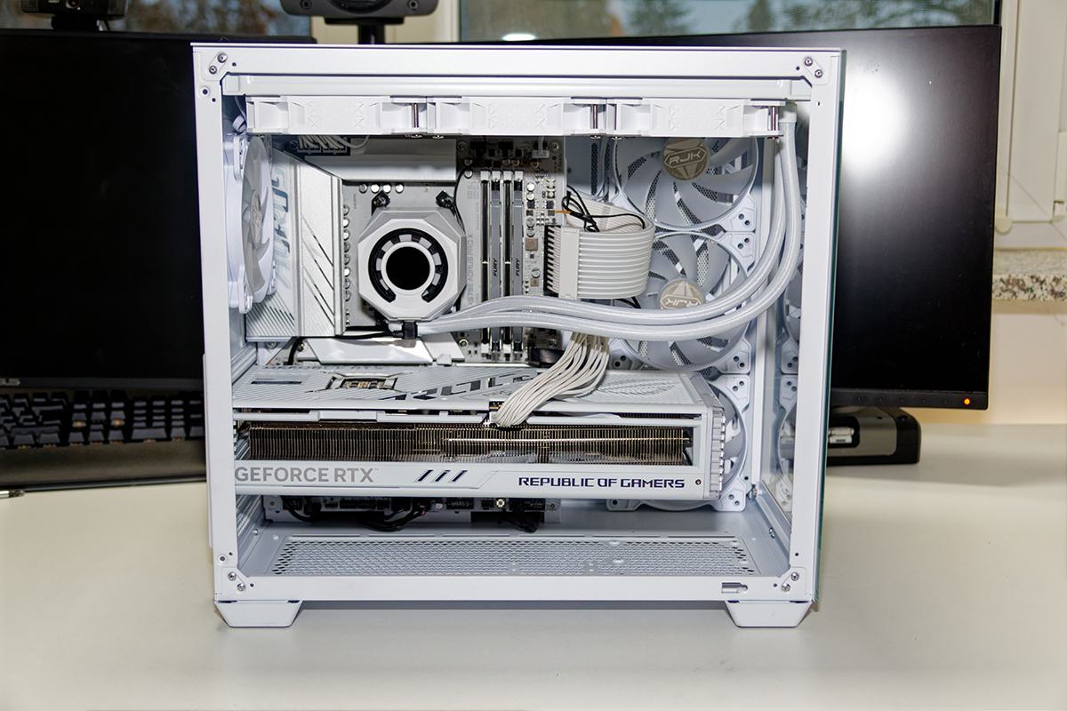 Das Case kommt in weiß daher und hat vier Lüfter aus dem eigenen Haus vorinstalliert. Einer im Heck ausblasend und drei an der Seite ausblasend.