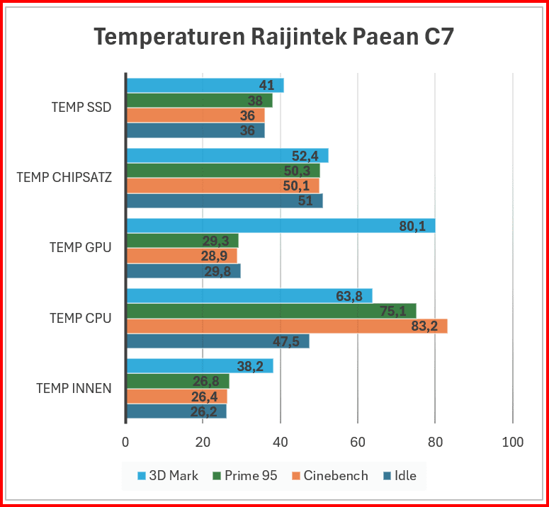 ABER! Ich war doch etwas erstaunt, wie leise man auch das deutlich kleinere Gehäuse von Raijintek bekommt. Zwar ist der höhere Lüfter- Ton des C7 auch im Idle stets vorhanden, aber in keiner Weise wirklich nervig. In dem Moment, in dem ich auf dfer Tastatur tippe, oder ich die Maus auf dem Pad umherschubse, geht das Grundsound vom Paean C7 schon fast unter. Wenn ich dann noch mein NAS, das ca. 3m hinter mir auf einem Schrank steht starte, ist der Sound vom C7 Nebensache.
