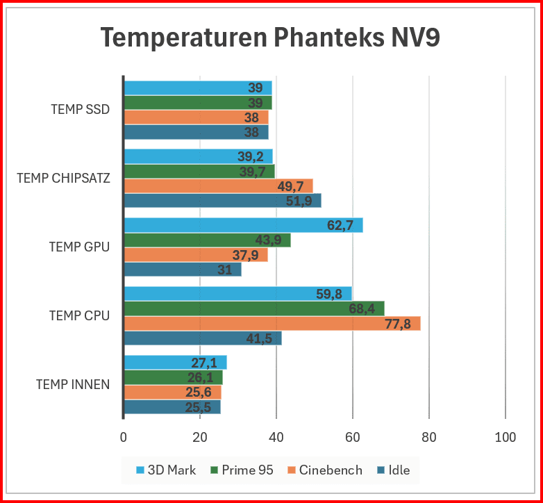 Die CPU- Temperaturen sind bei beiden Gehäusen eigentlich relativ egal. Denn in beiden Fällen kommt ja AIO- CPU- Kühlung zum Einsatz. Das NV9 könnte hier den Vorteil haben, dass der Radiator der AIO vllt kälter Luft von unten bekommen. Die Ergebnisse möchte ich lieber etwas weiter unten im Zusammenhang mit der AIO Cyclops 360 von Raijintek präsentieren.