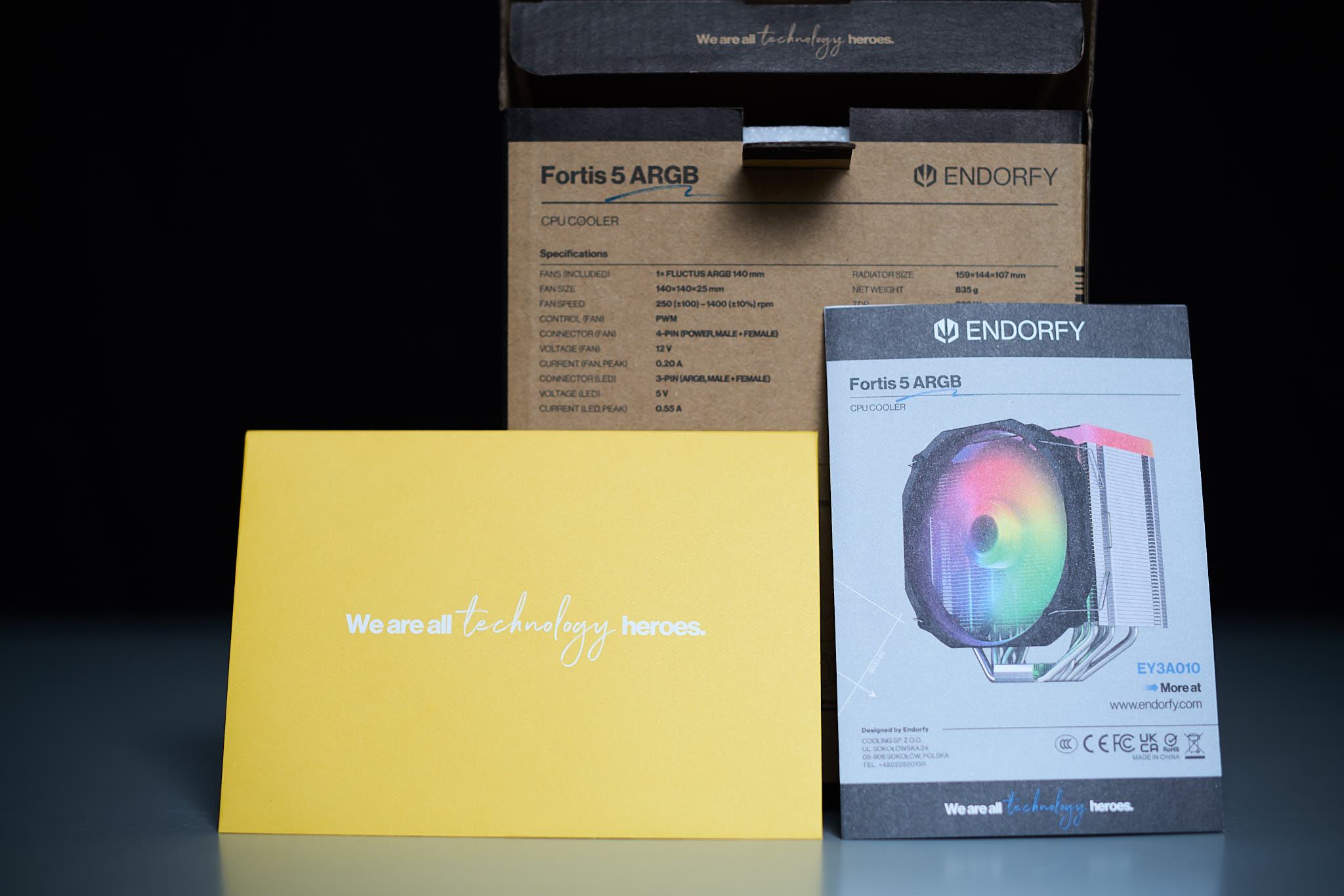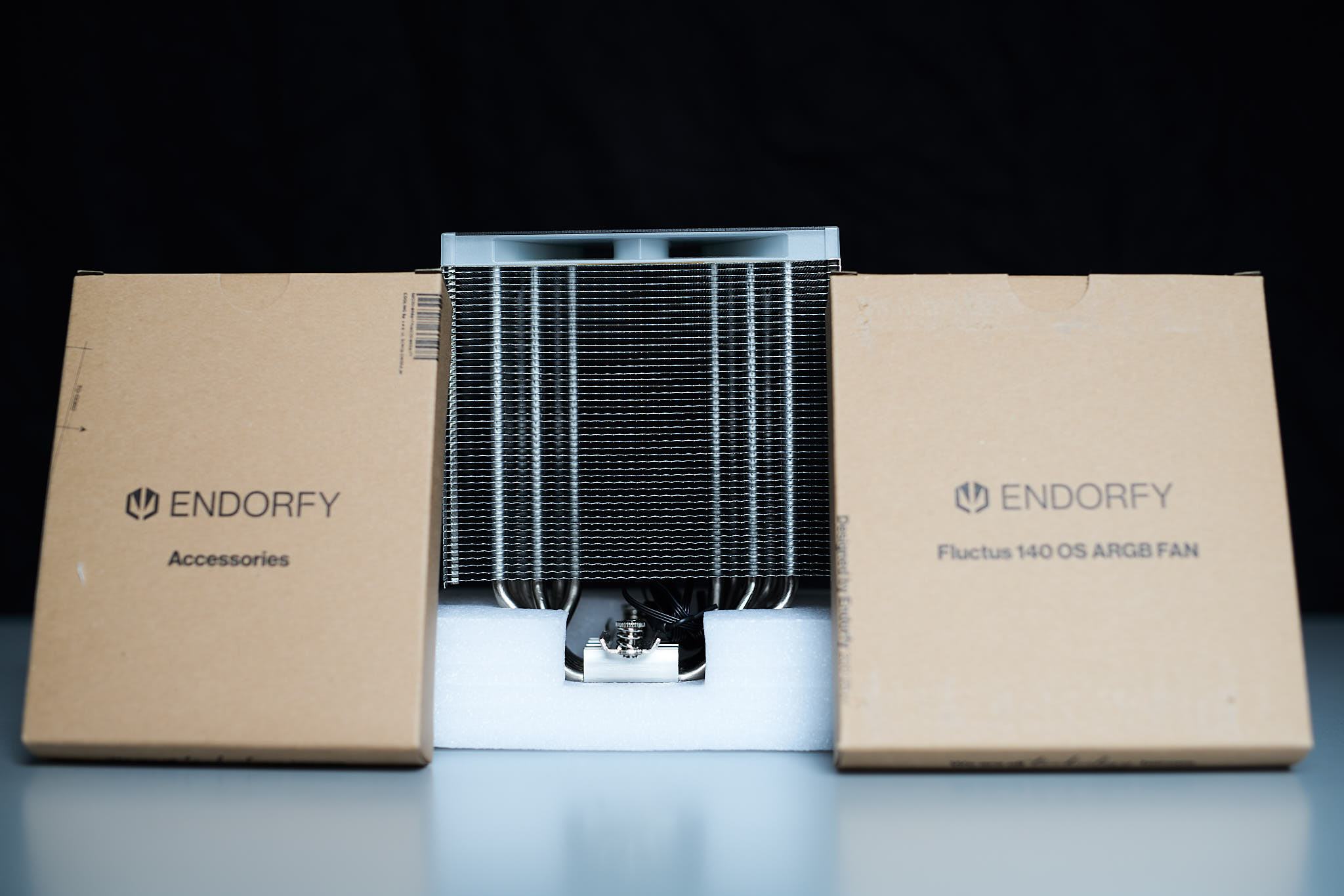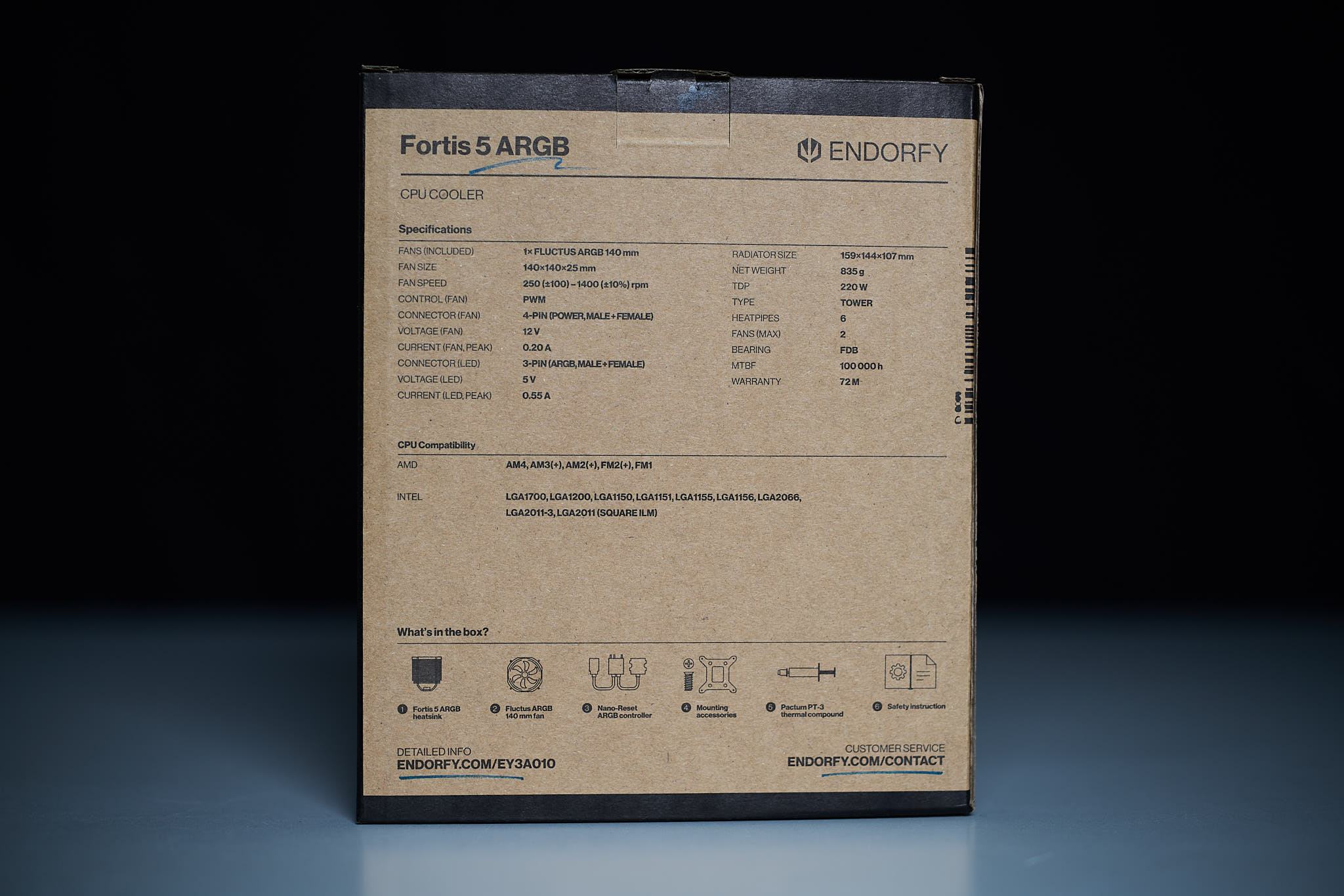 Der Karton des Fortis 5 ARGB ist eher schlicht, bedruckt mit einer Abbildung des Kühlers und beschriftet mit den wesentlichen technischen Daten. Im Karton findet sich der Kühlkörper, eine Schachtel mit den Montagematerialien, eine Schachtel mit dem Lüfter, die Montageanleitung und ein kleiner Umschlag mit einer Dankeskarte für Early Adopter (die bei später gekauften Kühlern evtl. nicht mehr beiliegen könnte).