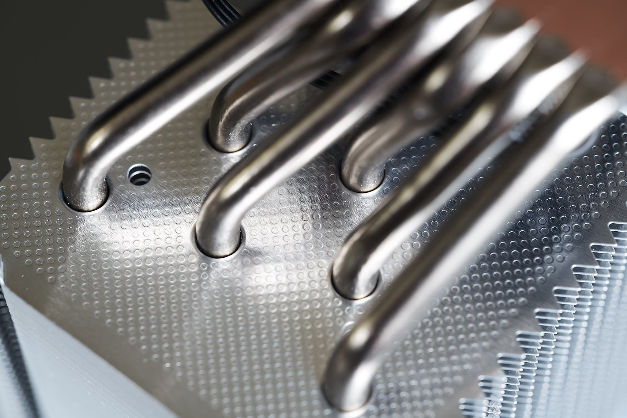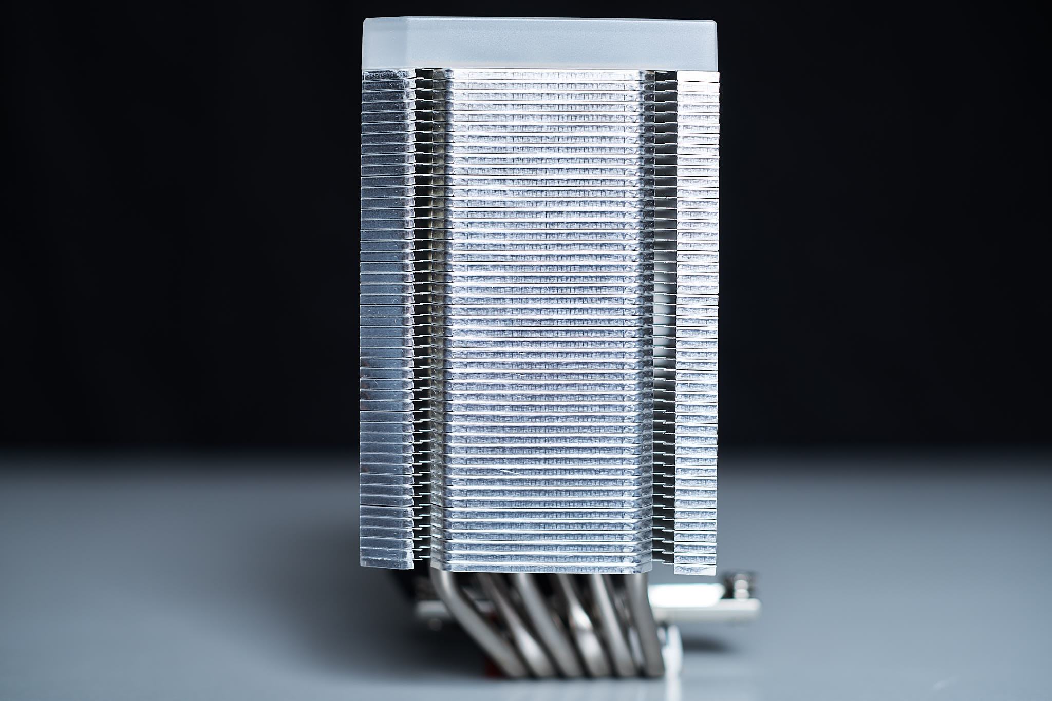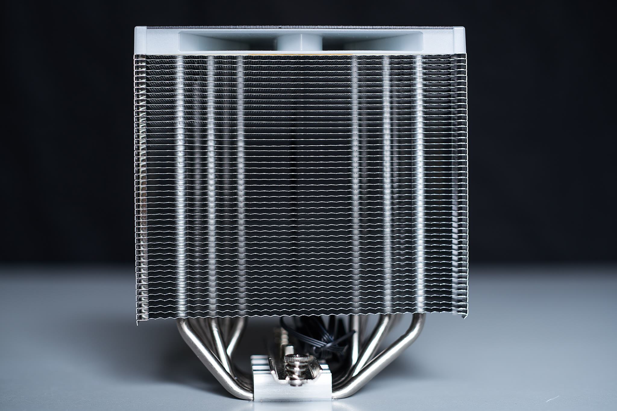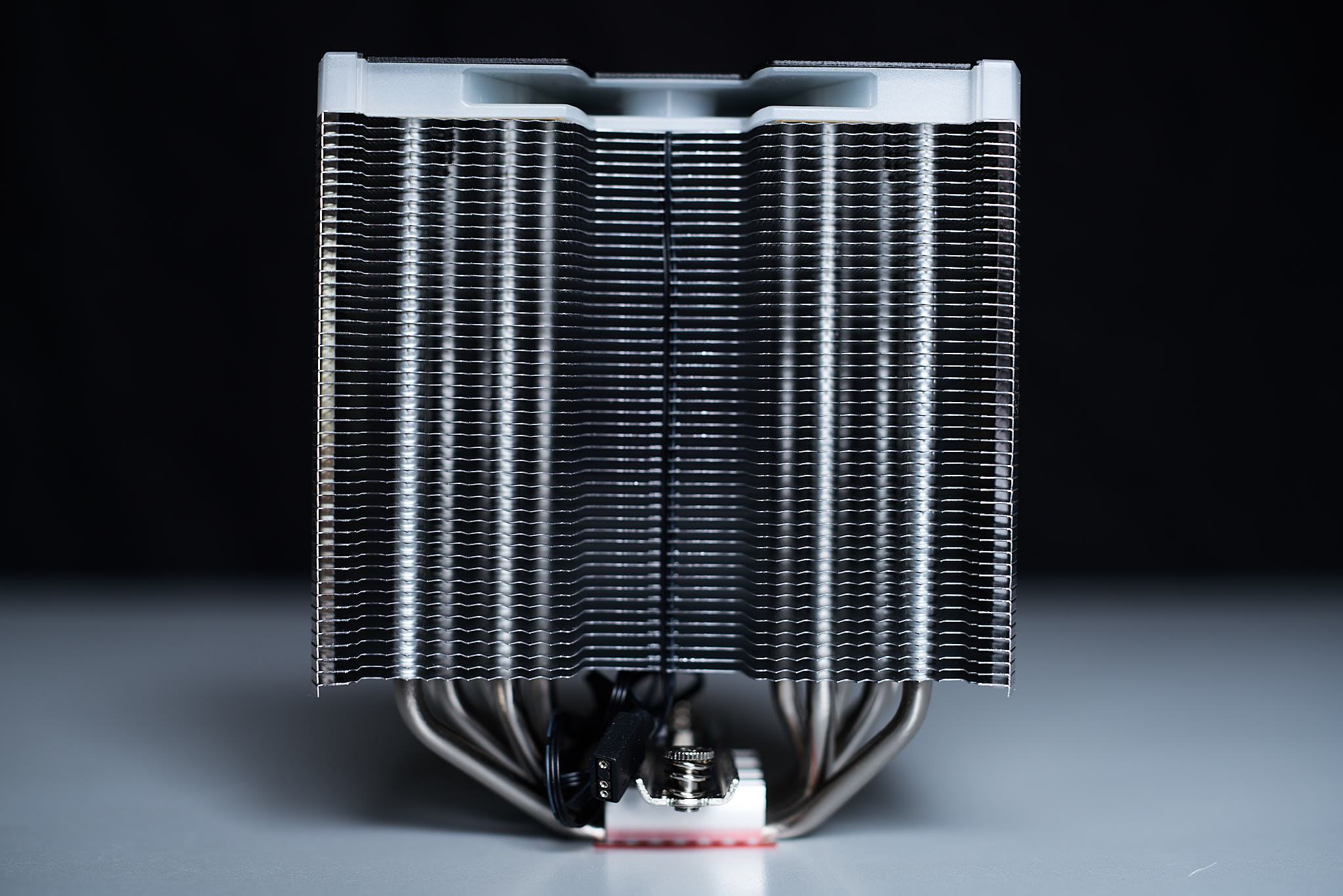 Der Kühlkörper des Fortis 5 (ARGB) ist ein Singletower Design, der die grundsätzliche Designsprache des Fortis 2 und Fortis 3 fortgesetzt. Während es beim Fortis 2 noch getrennte Lamellenpakete gibt, die bei späteren Versionen verbunden sind, erinnern Einschnitte zwischen den Heatpipepaketen erinnern aber immer noch an den Ursprung. Optisch auffällig sind ebenfalls die Sägezahnprofile an den Lamellenkanten. Wie schon beim Fortis 3 ist das Lamellenpaket des Kühlkörpers, um die Kompatibilität mit hohen RAM-Modulen zu erhöhen etwas nach hinten verschoben und ab dem Fortis 5 zusätzlich asymmetrisch um das Lamellenpaket weiter von den Erweiterungsslots zu entfernen, um Mainboard bzw. Grafikkartenkompatibilität zu erhöhen. Auf den Lamellen findet sich eine Noppenstruktur, ich könnte mir vorstellen, dass dadurch der Luftfluss, der über die Lamellen strömt, etwas zu verwirbelt wird und somit mehr des Luftvolumens, das den Kühler durchläuft zur Kühlung zu nutzen und nicht nur die Grenzschicht an der Lamellenoberfläche. Beim Fortis 5 ARGB besteht der Kühlerboden aus sechs Direct Touch Heatpipes, die abgesehen vom äußeren Rand der Bodenplatte scheinbar fließend ineinander übergehen. Die Blende auf dem Kühler besteht aus milchigem Kunststoff mit einer schwarz Lackierten Zierplatte aus Metall in der sich das Endorfy Logo befindet. In einem Spalt mittig im Lamellenpaket verläuft das ARGB-Kabel der Zierplattenbeleuchtung und ist mit einer Länge von 50 cm (+5 cm am Y-Kabel) ausreichend lang. Im Test sind mir die vergleichsweise dünnen Lamellen mit nur 0,3mm Dicke aufgefallen (NH-D15s 0,5mm; AK400 0,4mm), die etwas fragiler wirken. Dies lässt den Kühler bei sonst makelloser Verarbeitung etwas weniger wertig erscheinen, sofern es hierdurch keinen negativen Effekt auf die Kühlleistung gibt, würde ich es insgesamt aber nicht als negativ bewerten.