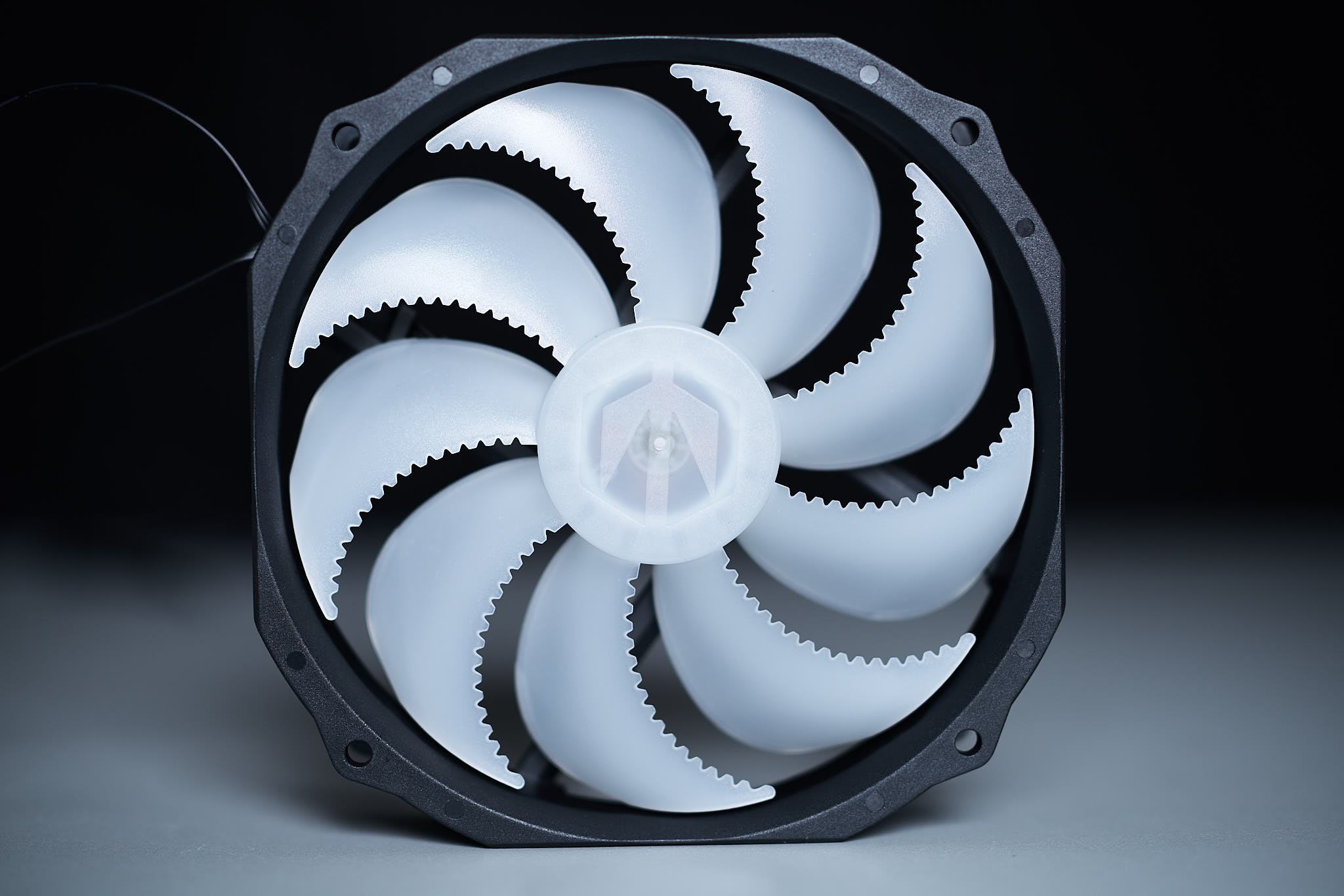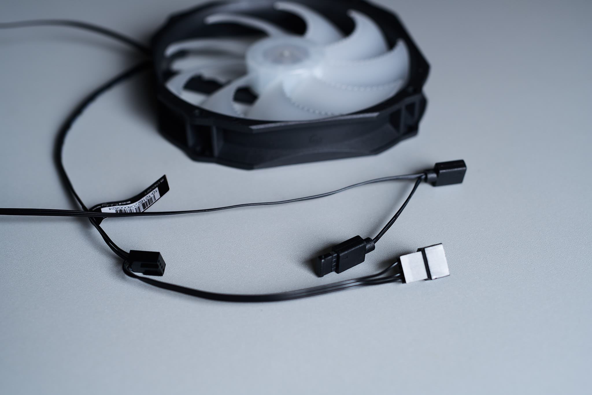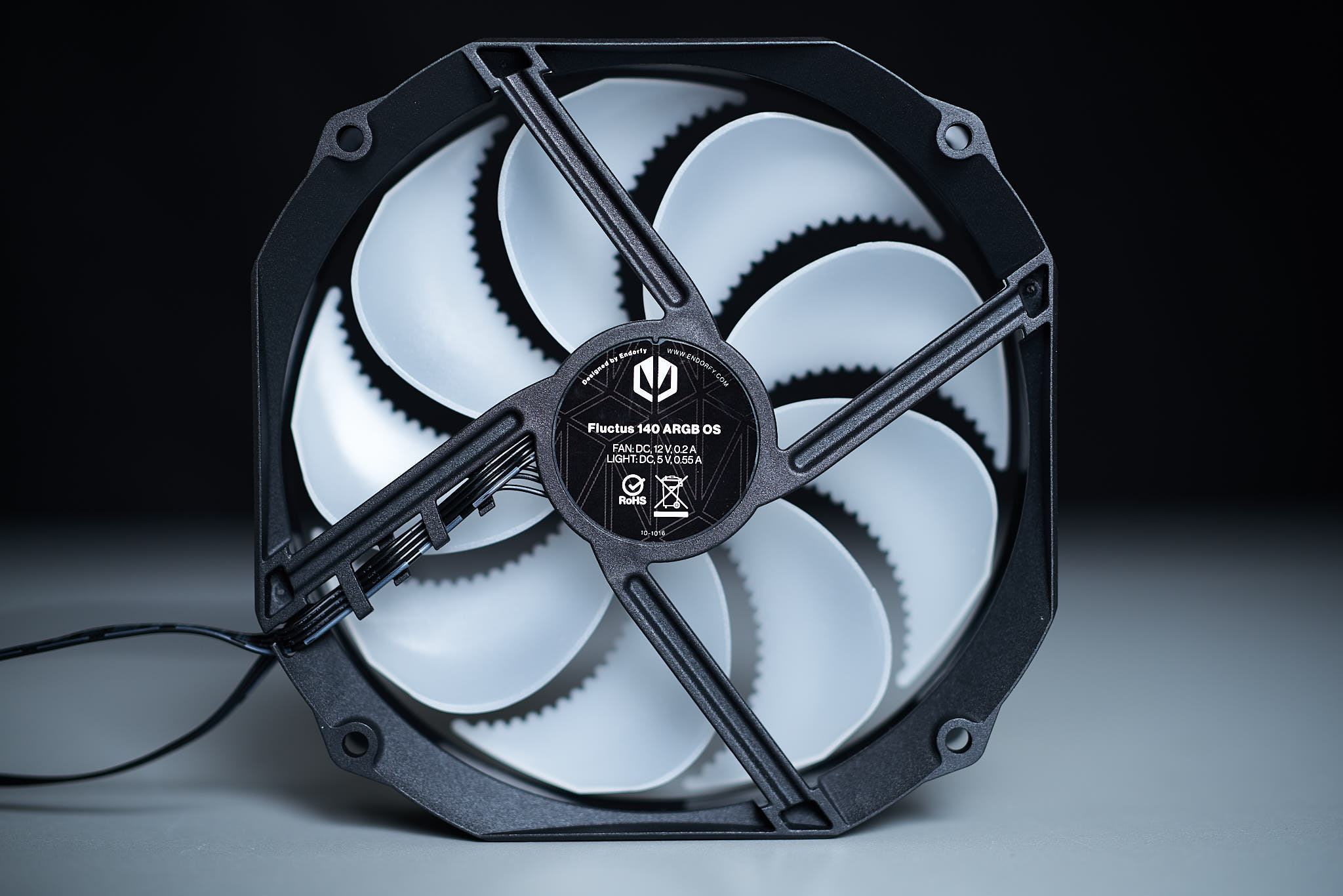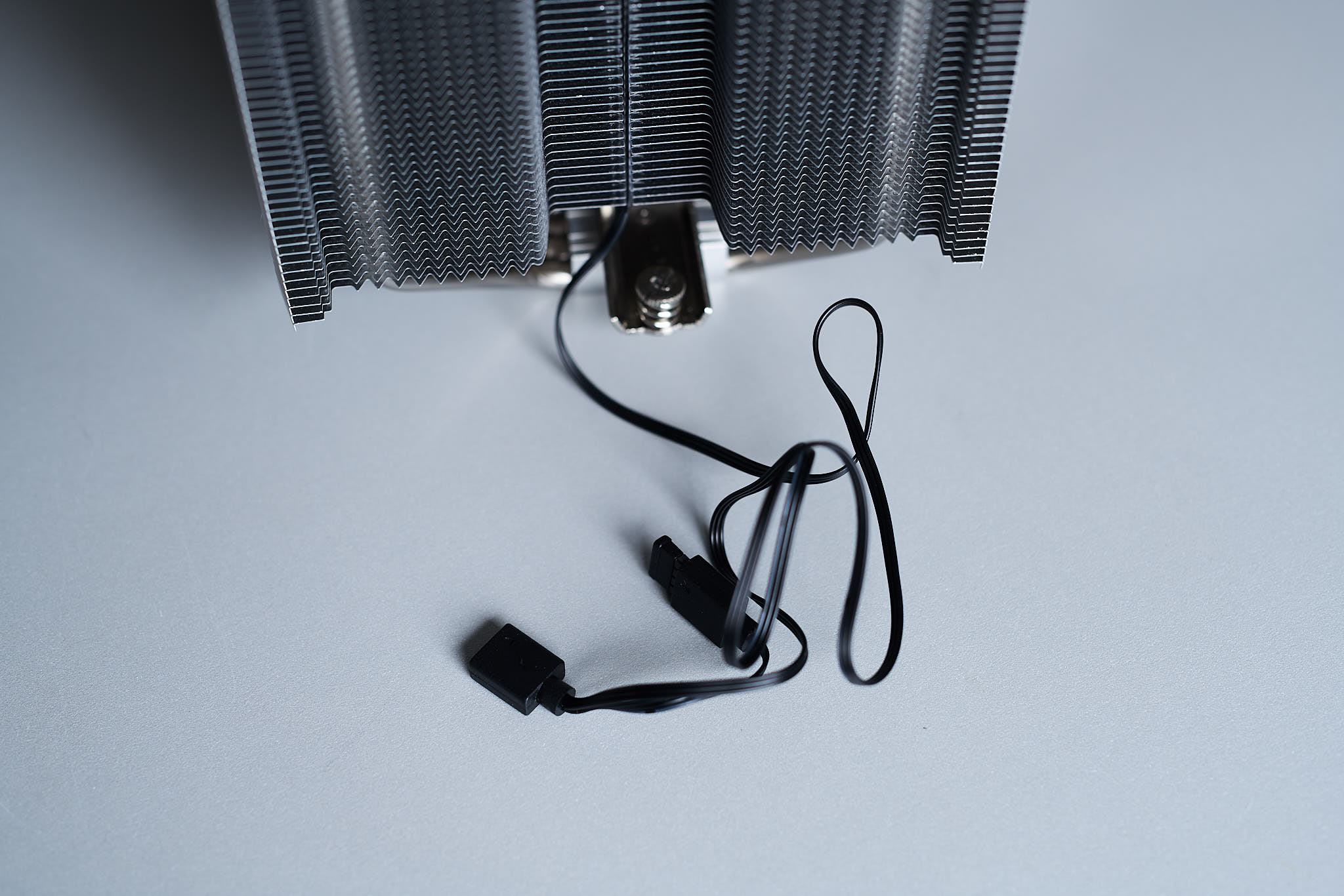 Der beigelegte Fluctus 140 ARGB OS Lüfter ließ sich sogar noch unter die angegebene Minimaldrehzahl von 250rpm (+/- 100rpm) drosseln und lief noch mit minimal 128rpm (akustisch ermittelt, da das Lüftertachometer keinen Drehzahlwert mehr ausgab), der Lüfter bleibt bei sehr niedrigem PWM-Signal komplett stehen (Fanstop). Die Maximaldrehzahl des Lüfters liegt mit etwa 1430rpm gut innerhalb der Spezifikationen. Sowohl das Lüfterkabel als auch das ARGB-Kabel haben ein integriertes Y-Kabel was das Verkabeln von Kühlerbeleuchtung und die Einbindung eines zweiten Lüfters vereinfacht. Das Lüfterkabel hat eine Länge von 19cm + 12cm, das ARGB-Kabel eine Länge von 57cm + 5cm.
