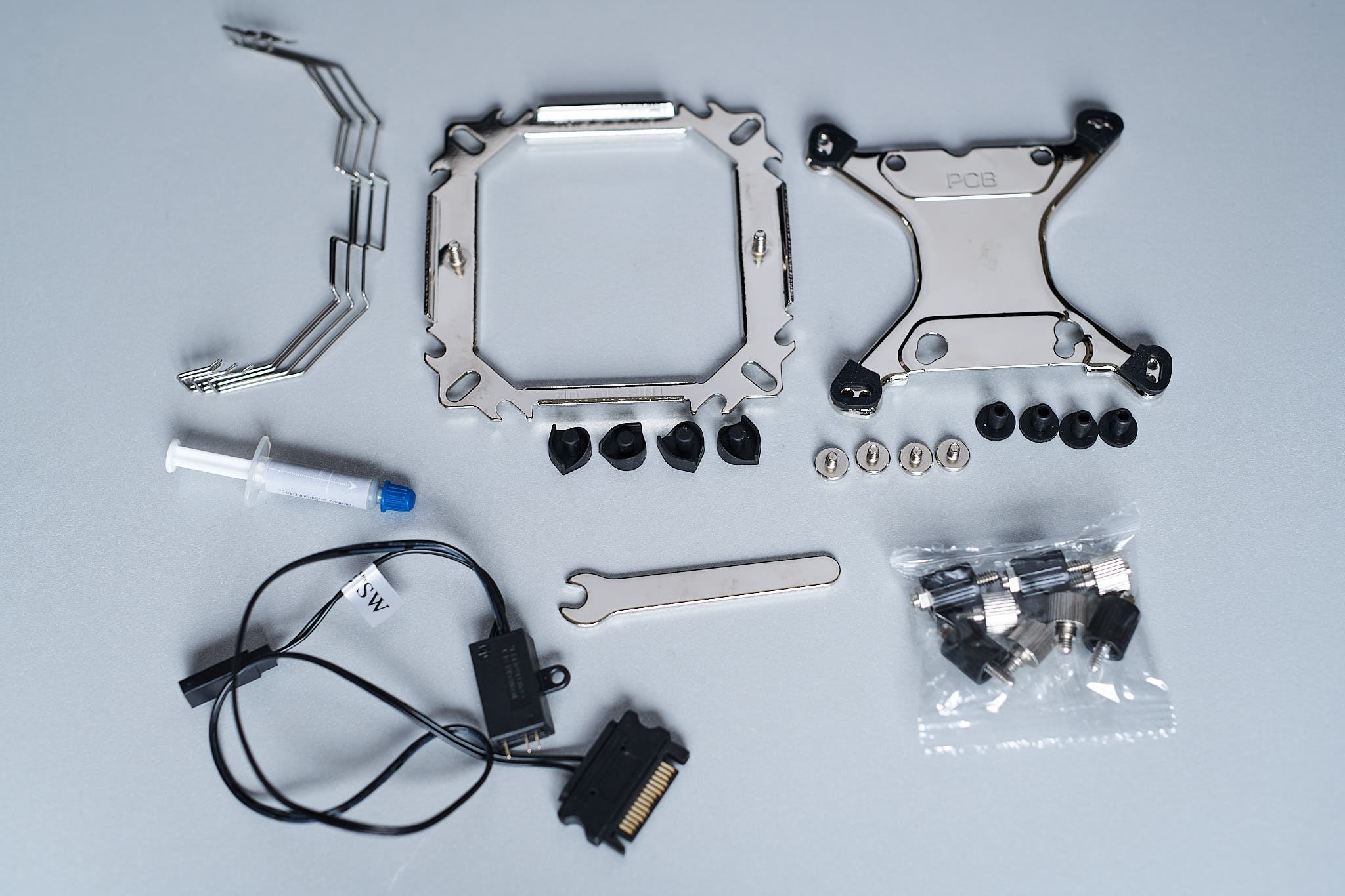 Im Lieferumfang finden sich Montagematerialien für alle aktuellen Sockel und auch einige ältere Sockel, die teilweise schon EOL sind. Gerade in Bezug auf die Kompatibilität mit älteren Sockeln ist es lobenswert einen dedizierten RGB-Controller beizulegen, mit dem die Beleuchtung des Kühlers gesteuert werden kann. Ansonsten findet sich eine Spitze Wärmeleitpaste, die für ein paar Anwendungen reichen sollte und ein zweites Paar Lüfterklammern im Lieferumfang, mit den ein zusätzlicher 120mm Lüfter an der Rückseite des Lamellenpakets befestigt werden kann. Für den 140mm Lüfter des Fortis 5 ARGB werden insgesamt 8 Gummipuffer beigelegt, um den Lüfter so weit wie möglich vom Kühlkörper zu entkoppeln. Auch wenn die Kompatibilität mit älteren Sockeln zu loben ist, muss ich zumindest im Fall von den älteren AMD-Sockeln etwas Kritik aussprechen, da Sockel AM2/AM3 von Platine bis Heatspreaderoberfläche etwa 1mm höher ist als AM4 und bei der Verwendung eines Abstandshalters für beide Sockel somit unterschiedlicher Anpressdruck anliegt. Hier hätte man z.B. zusätzliche Unterlegscheiben beilegen können, um die Höhendifferenz auszugleichen.