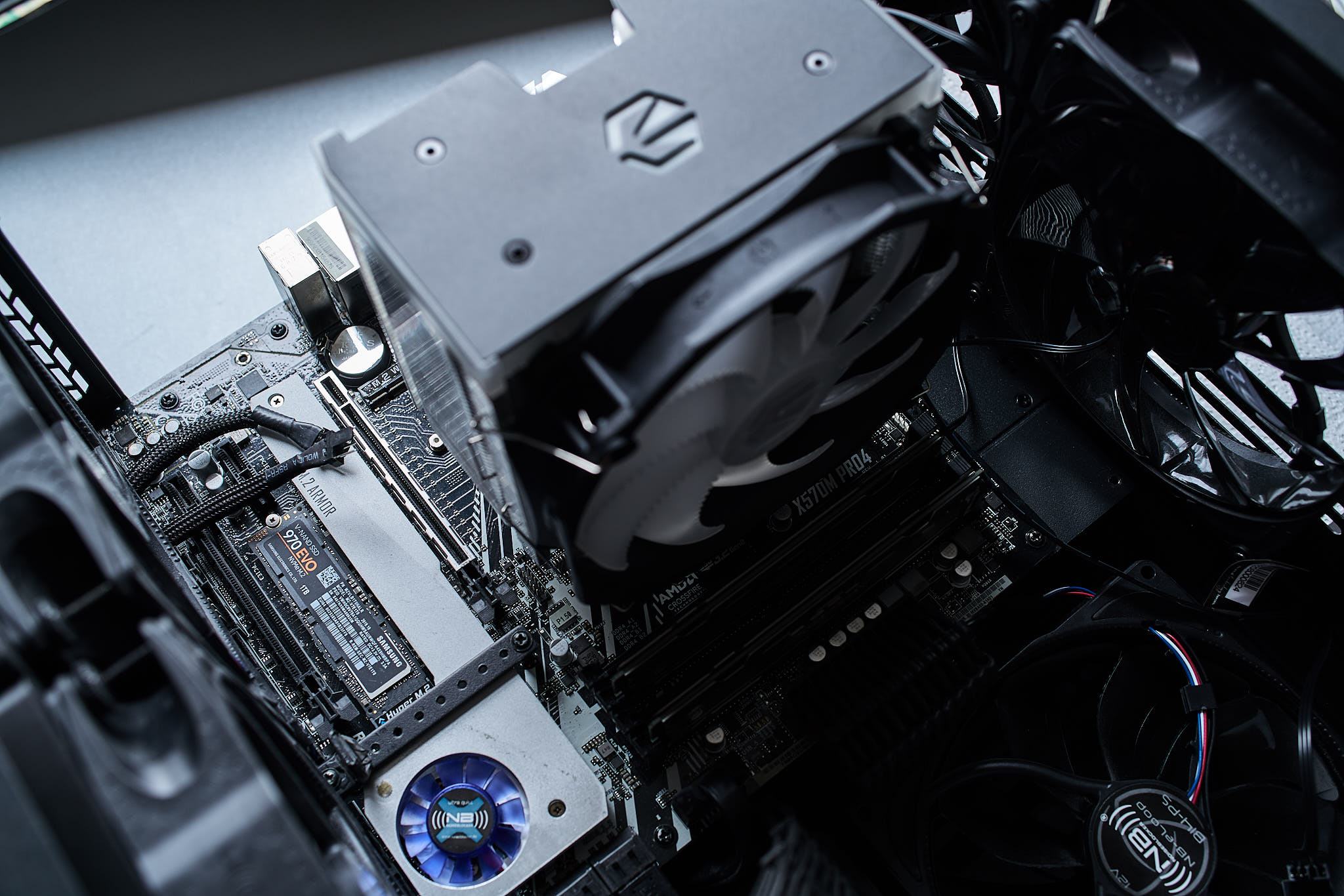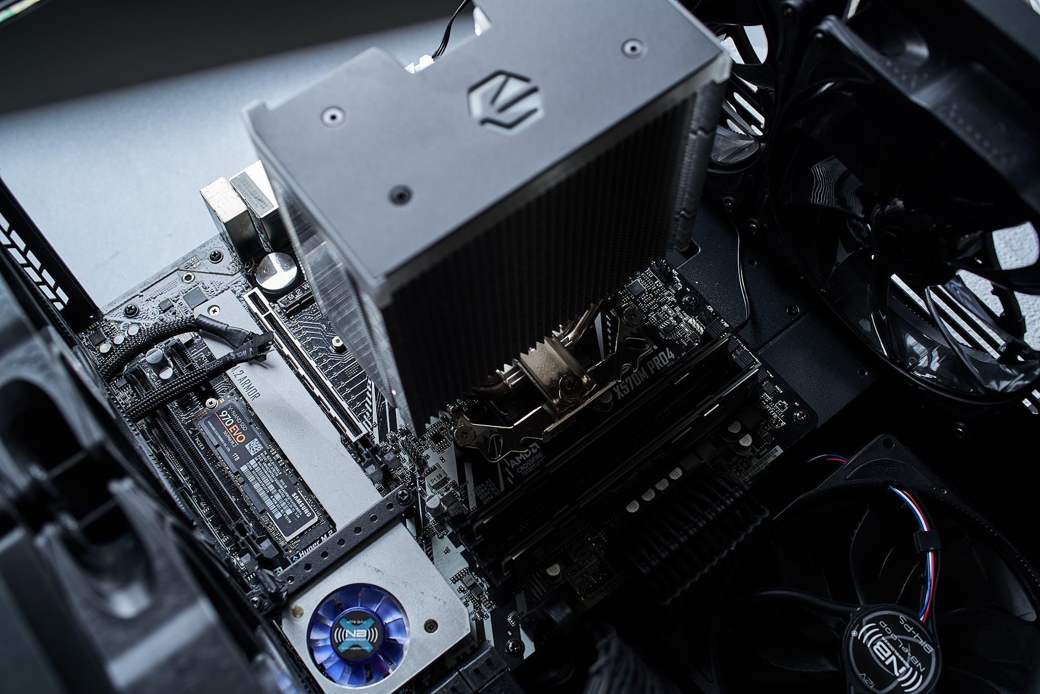 Für die Montage auf AM4 müssen die Standard Montagebrackets entfernt werden, anschließend werden vier Abstandshalter in die AMD Backplate geschraubt und die Montageplatte in der gewünschten Orientierung aufgelegt und abschließend mit vier Schrauben fixiert werden. Abschließend wird der Kühlkörper auf der Montageplatte fest verschraubt und der Lüfter mit den beiliegenden Lüfterklammern eingehängt. Grundsätzlich ist es möglich den Fortis 5 ARGB auch auf AMD-Sockeln um 90° gedreht zu montieren.