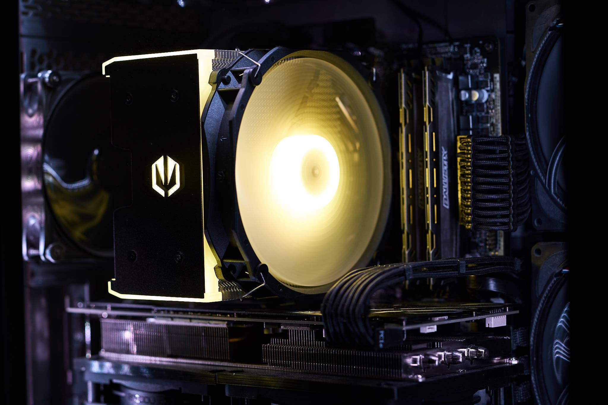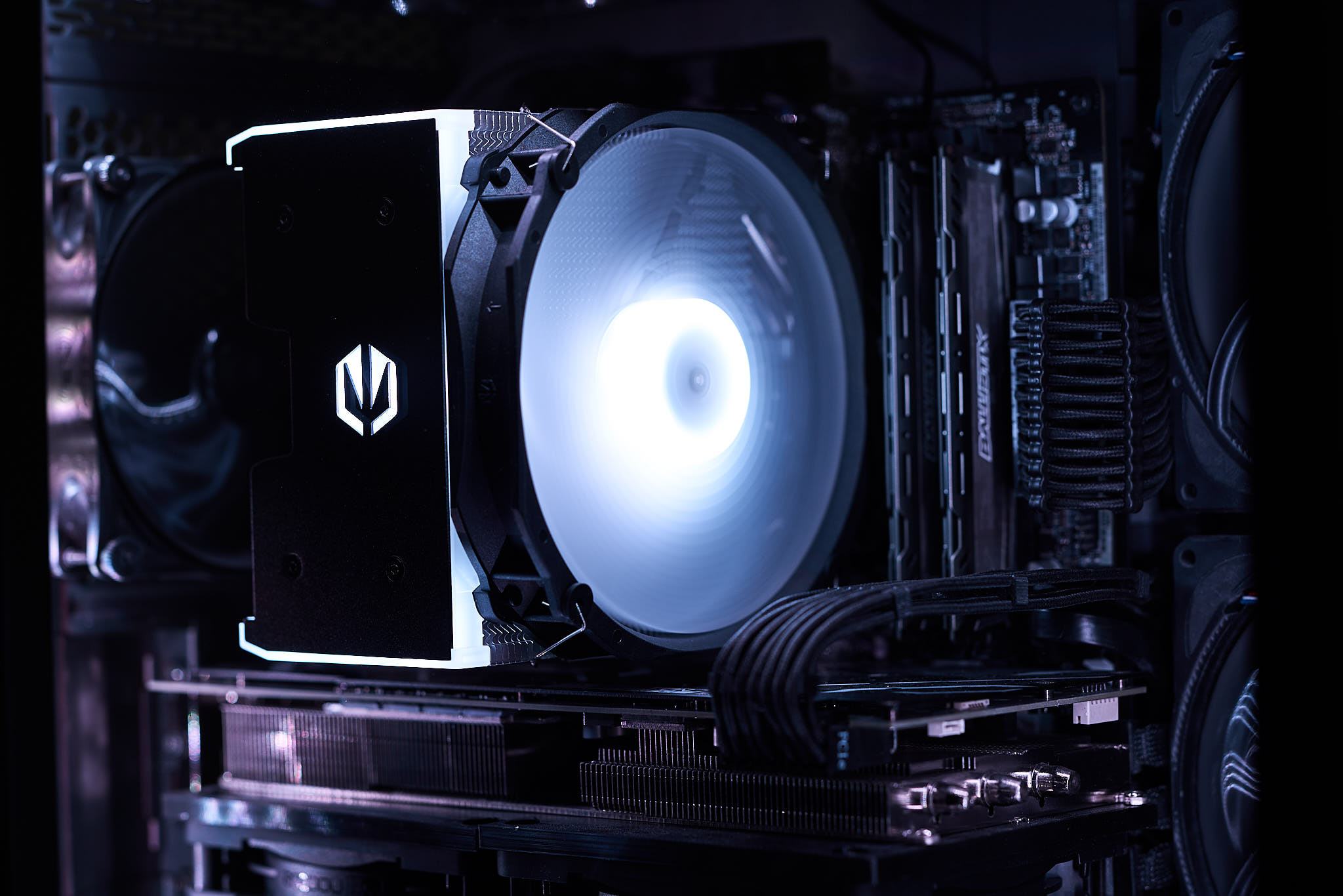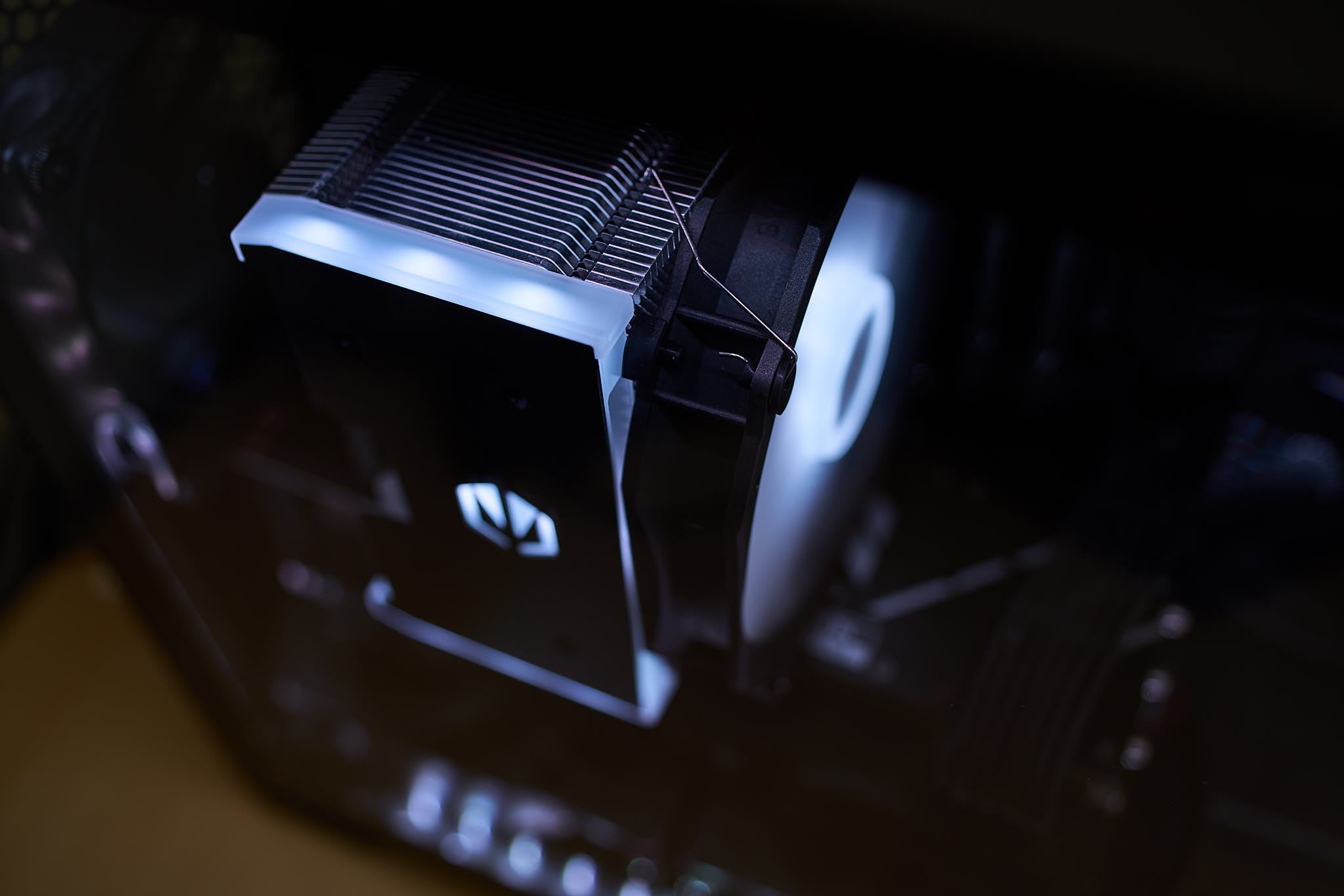Die ARGB-Beleuchtung des Fortis 5 ARGB teilt sich auf in die Beleuchtung der Deckplatte des Kühlers und den Lüfter. Dabei befinden sich 9 LEDs in der Abdeckung und 8 LEDs in der Lüfternabe. Durch die Konzentration LEDs in der Lüfternabe ist ein deutlicher Helligkeitsabfall zu den Blattspitzen erkennbar. In der Beleuchtung der Abdeckung sind durch die geringe Anzahl an LEDs je nach Betrachtungswinkel Hotspots sichtbar. Mit dem mitgelieferten ARGB-Controller lässt sich die Beleuchtung mit vorgegebenen Beleuchtungsmuster bzw. festen Farben einstellen.