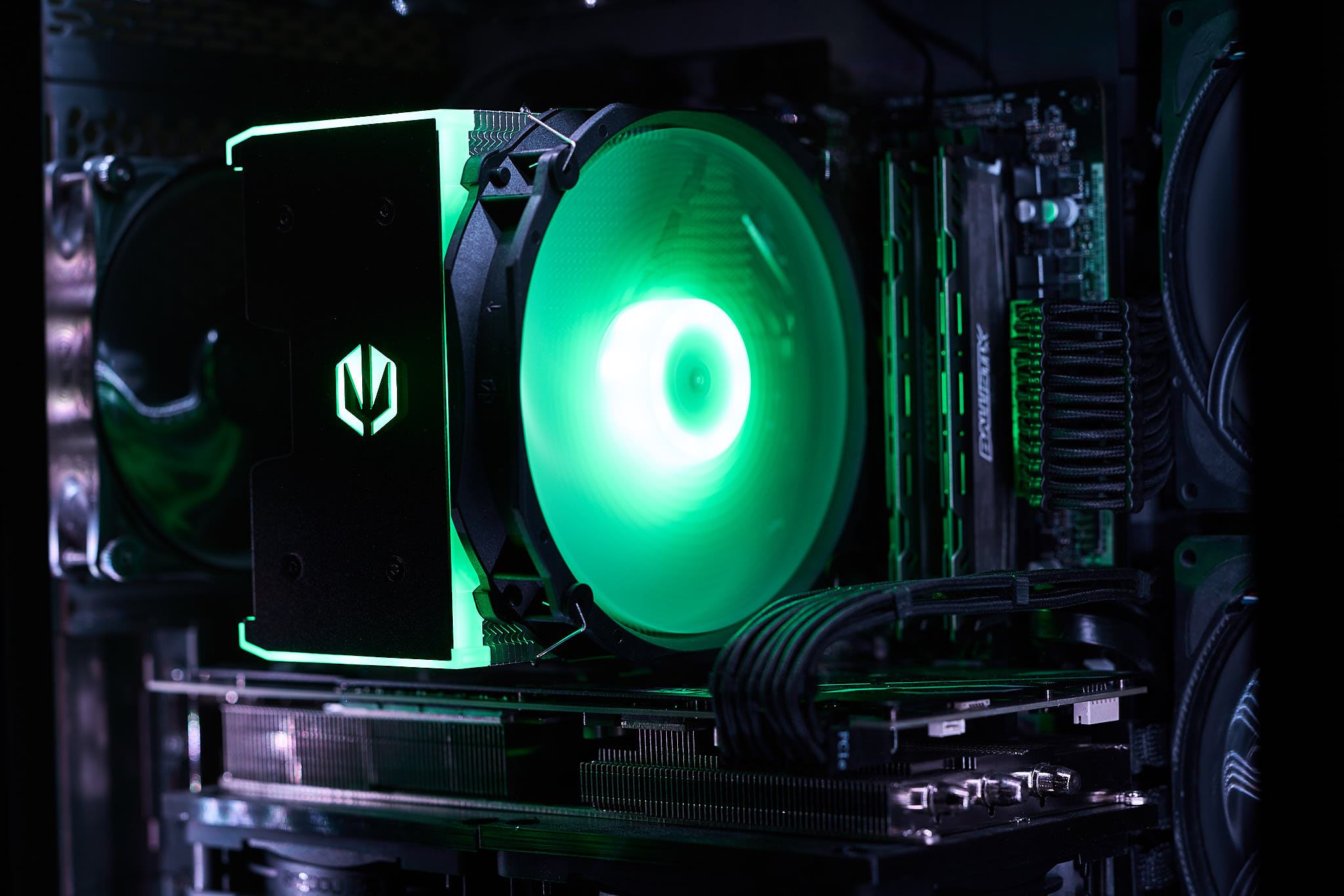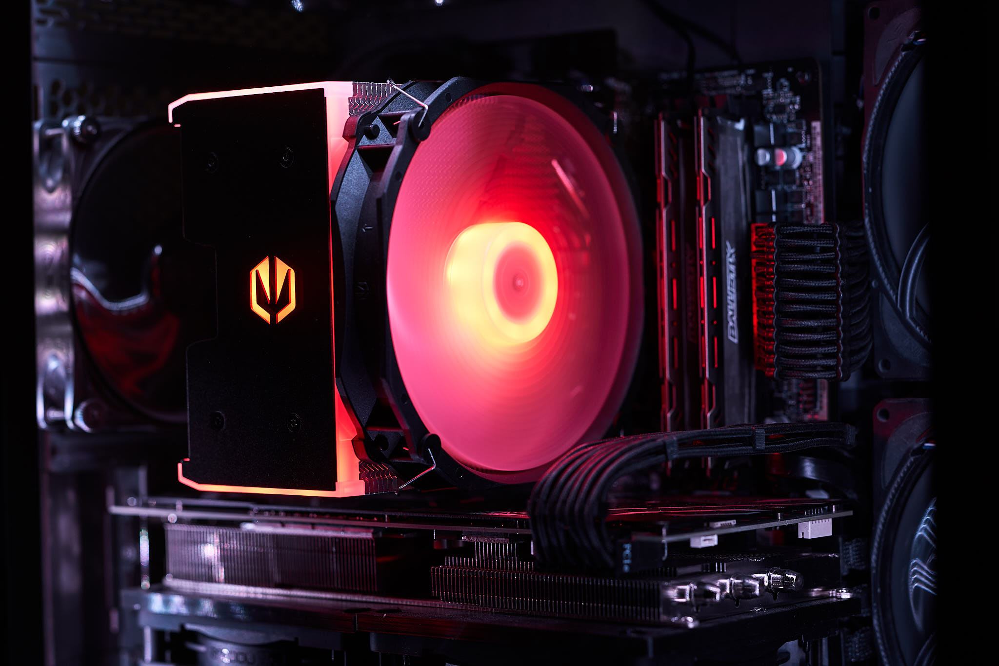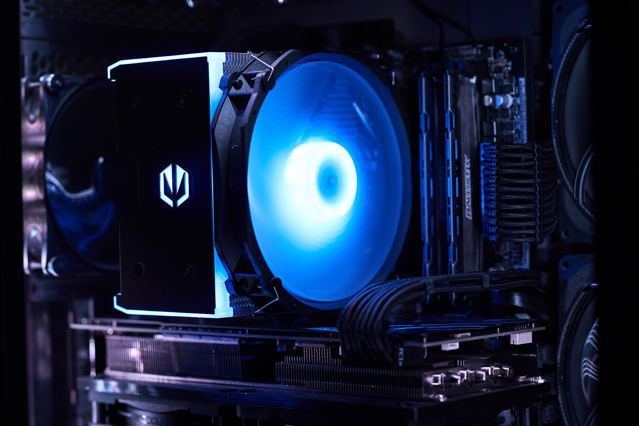 Die ARGB-Beleuchtung des Fortis 5 ARGB teilt sich auf in die Beleuchtung der Deckplatte des Kühlers und den Lüfter. Dabei befinden sich 9 LEDs in der Abdeckung und 8 LEDs in der Lüfternabe. Durch die Konzentration LEDs in der Lüfternabe ist ein deutlicher Helligkeitsabfall zu den Blattspitzen erkennbar. In der Beleuchtung der Abdeckung sind durch die geringe Anzahl an LEDs je nach Betrachtungswinkel Hotspots sichtbar. Mit dem mitgelieferten ARGB-Controller lässt sich die Beleuchtung mit vorgegebenen Beleuchtungsmuster bzw. festen Farben einstellen.