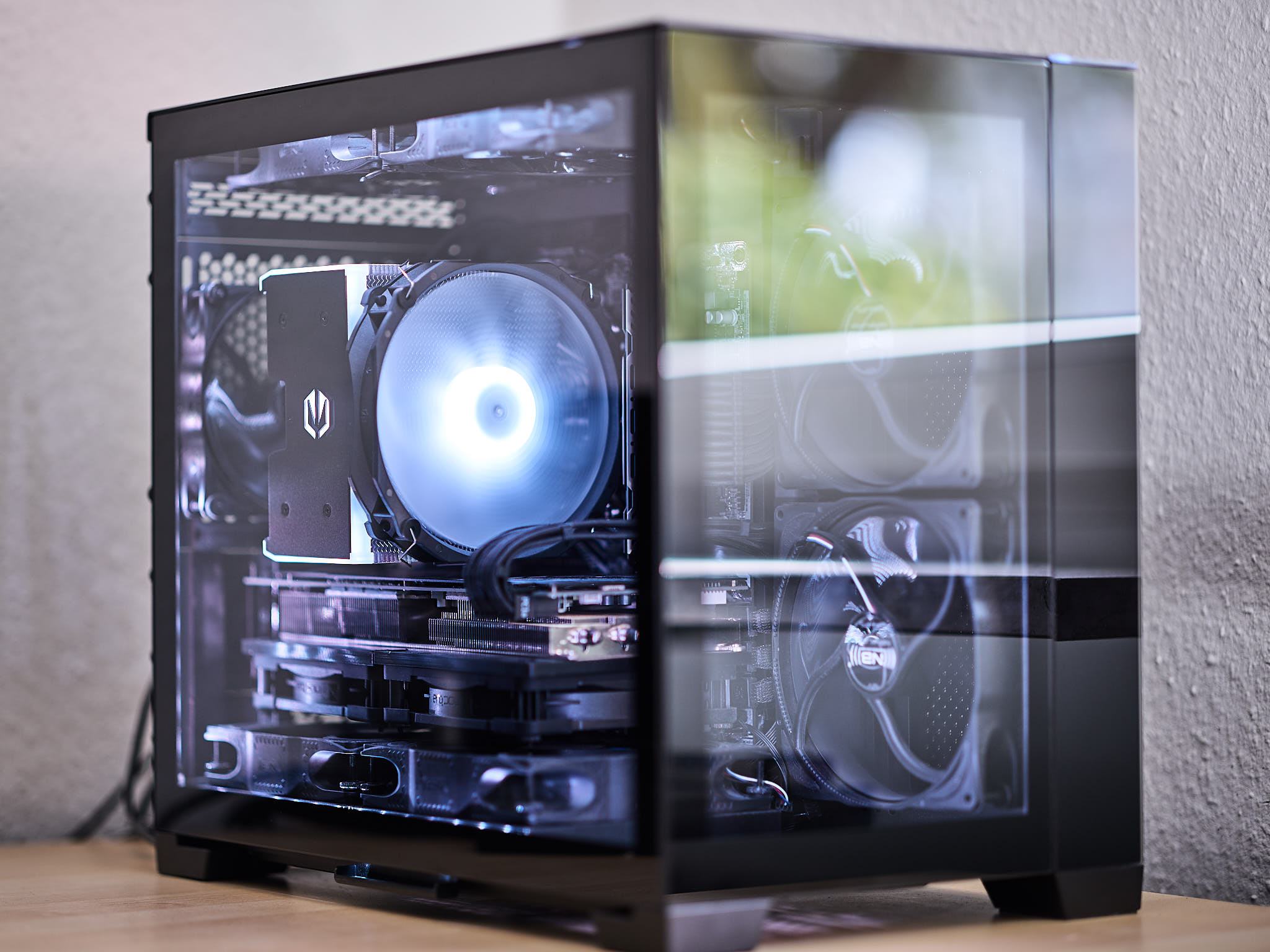 - Lian Li O11D Mini mit 6x 140mm Noiseblocker eLoop B14-PS und einem Noiseblocker eLoop B12-PS (gesteuert durch ein Aquacomputer Quadro)