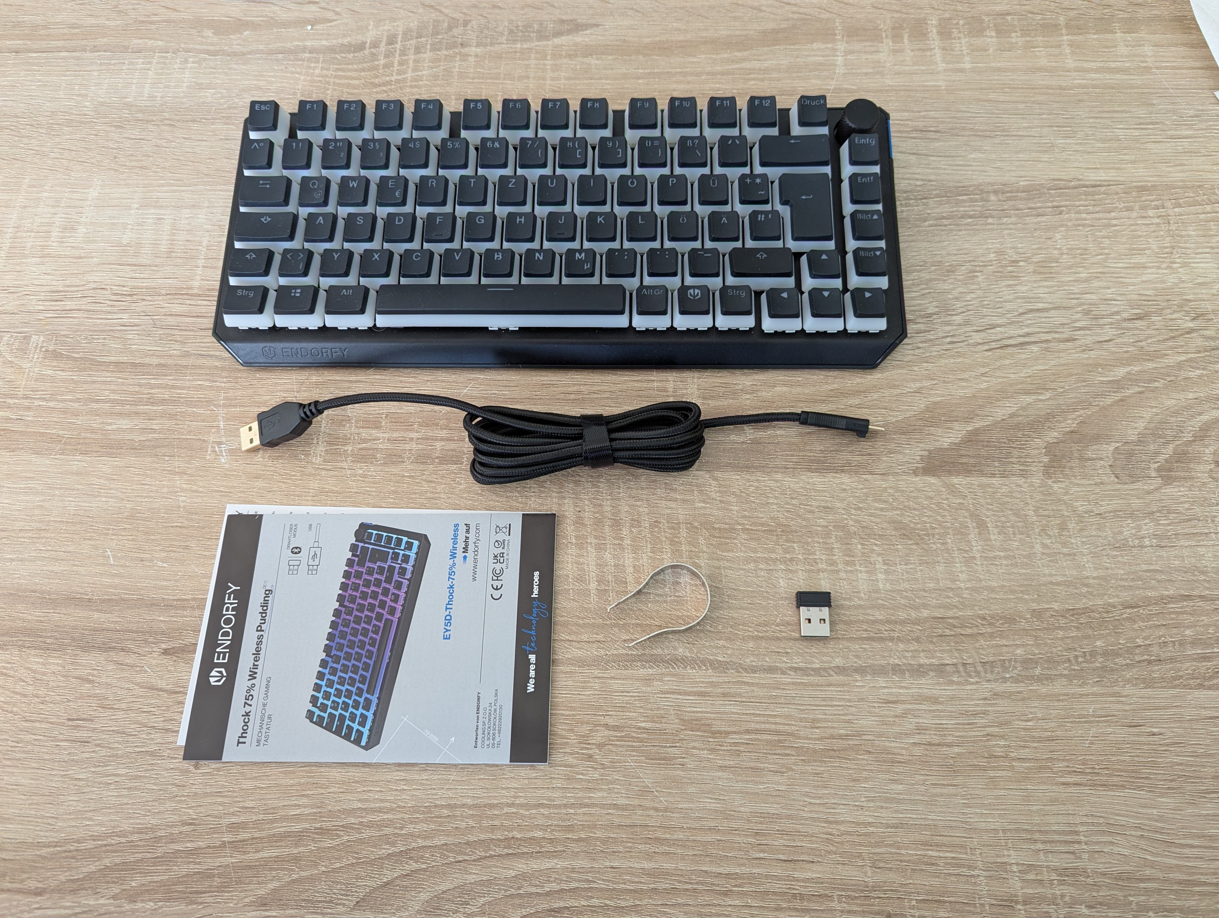 Fürs Gaming und bei begrenztem Platz ist die Endorfy Thock 75% Wireless Pudding sehr zu empfehlen. Gerade der Preis und die Verarbeitungsqualität sind überzeugend. Auch die Pudding-Tastenkappen sind schön beleuchtet. Einzig die teils ungleichmäßige Beleuchtung und die Schriftart finde ich weniger gelungen. Die Software ist “nur” zweckmäßig, aber allzu viel Zeit verbringt man damit vermutlich nicht. Eine (kostenlose) Handballenauflage wäre gerade für die Nutzung im Homeoffice angenehm gewesen. Der Einfluss der fehlenden Medientasten, Makrotasten und der Ziffernblock ist sehr Nutzerabhängig, in meinem Fall ist das nur im Homeoffice negativ. Wer eine kompakte Gaming Tastatur sucht, kann hier ohne Bedenken zugreifen.