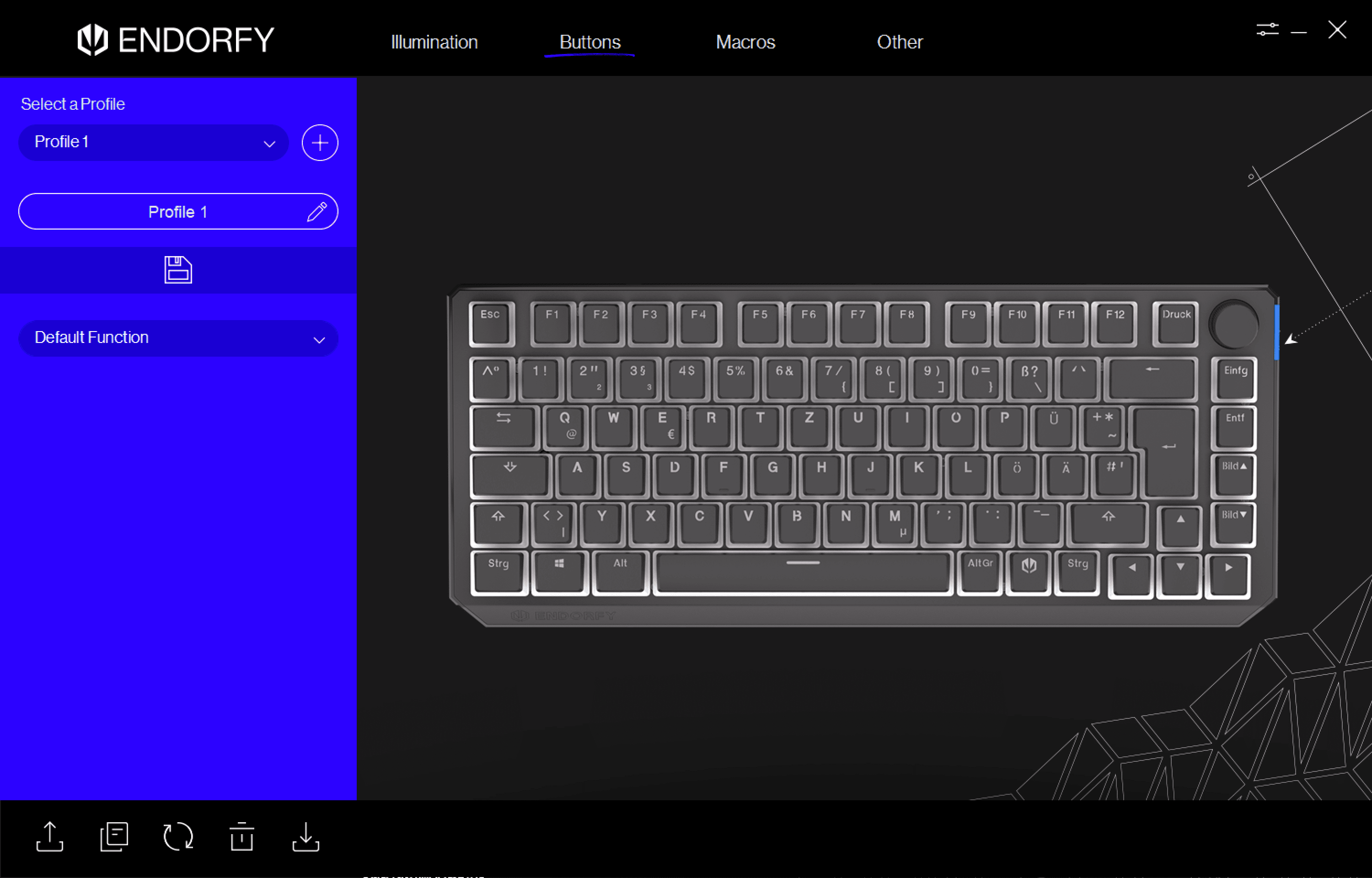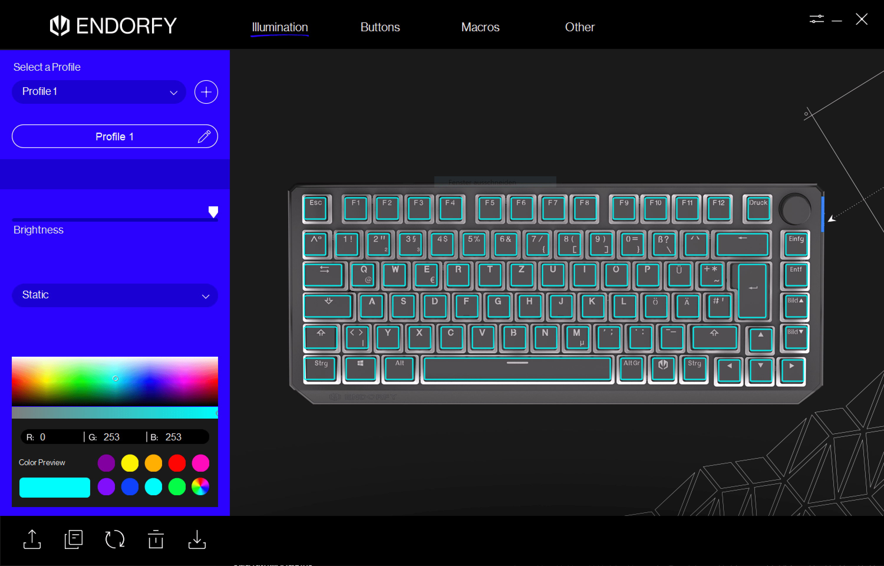 Anfangs war ich verwundert, dass man die Tastatur via USB anschließen muss, um auf die Software zugreifen zu können. Das hat aber den Vorteil, dass die eingestellten Farben auf der Tastatur gespeichert werden und bei einem PC-Wechsel mit übernommen werden. Das Programm bietet 18 Beleuchtungsmodi, die Möglichkeit, Tasten neu zuzuweisen und erstellbare Makros. Es lassen sich auch mehrere Profile erstellen. Was mir negativ aufgefallen ist, ist die nicht änderbare Größe des Programmfensters. Wenn in Windows eine Skalierung eingestellt ist, wird unter Umständen nicht das komplette Fenster dargestellt.