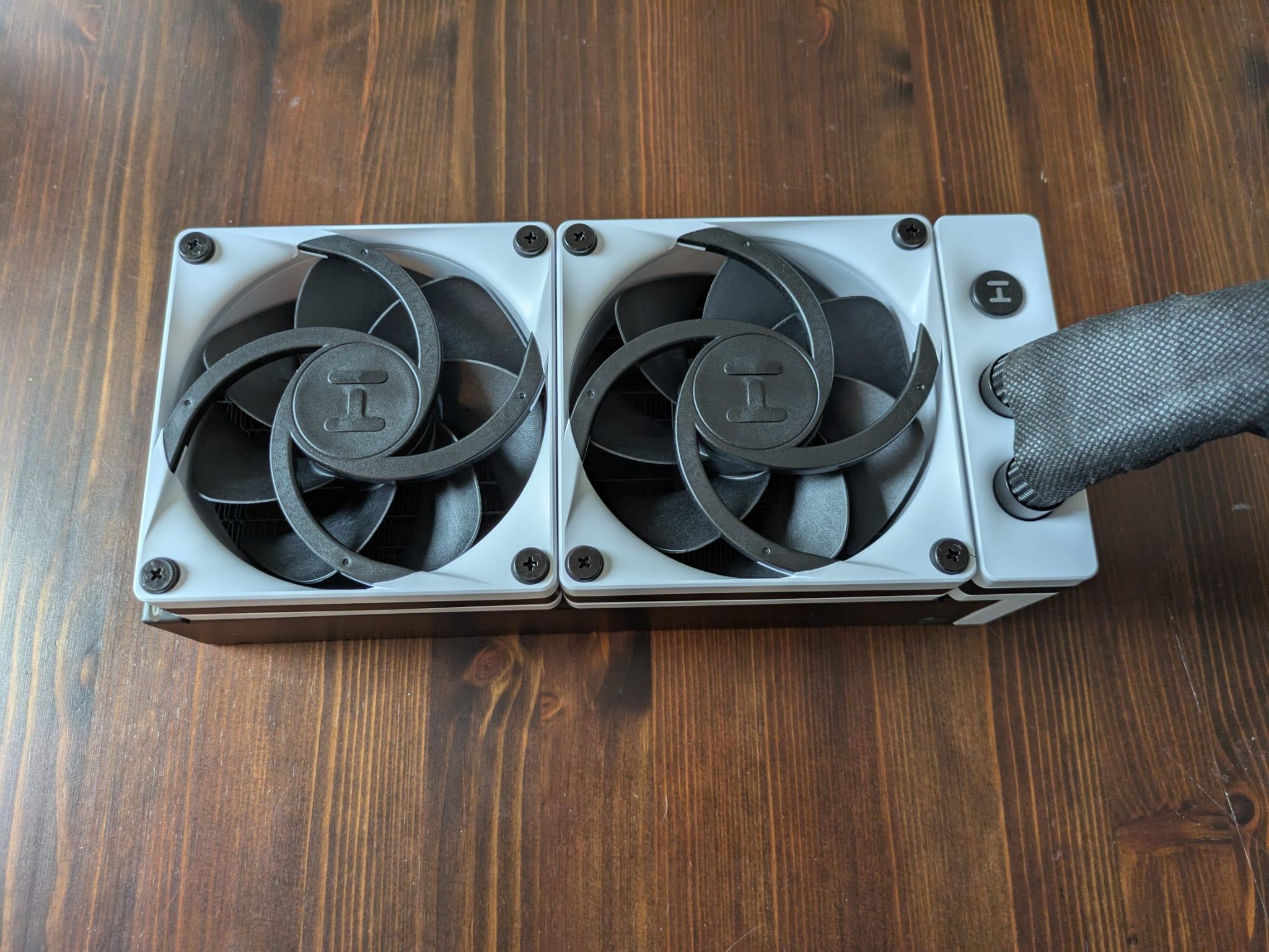 Da die AIO für den Seiteneinbau gedacht ist, musste ich zusätzlich noch die Lüfter drehen, weil die Lüfter im Auslieferungszustand auf Pull konfiguriert sind.