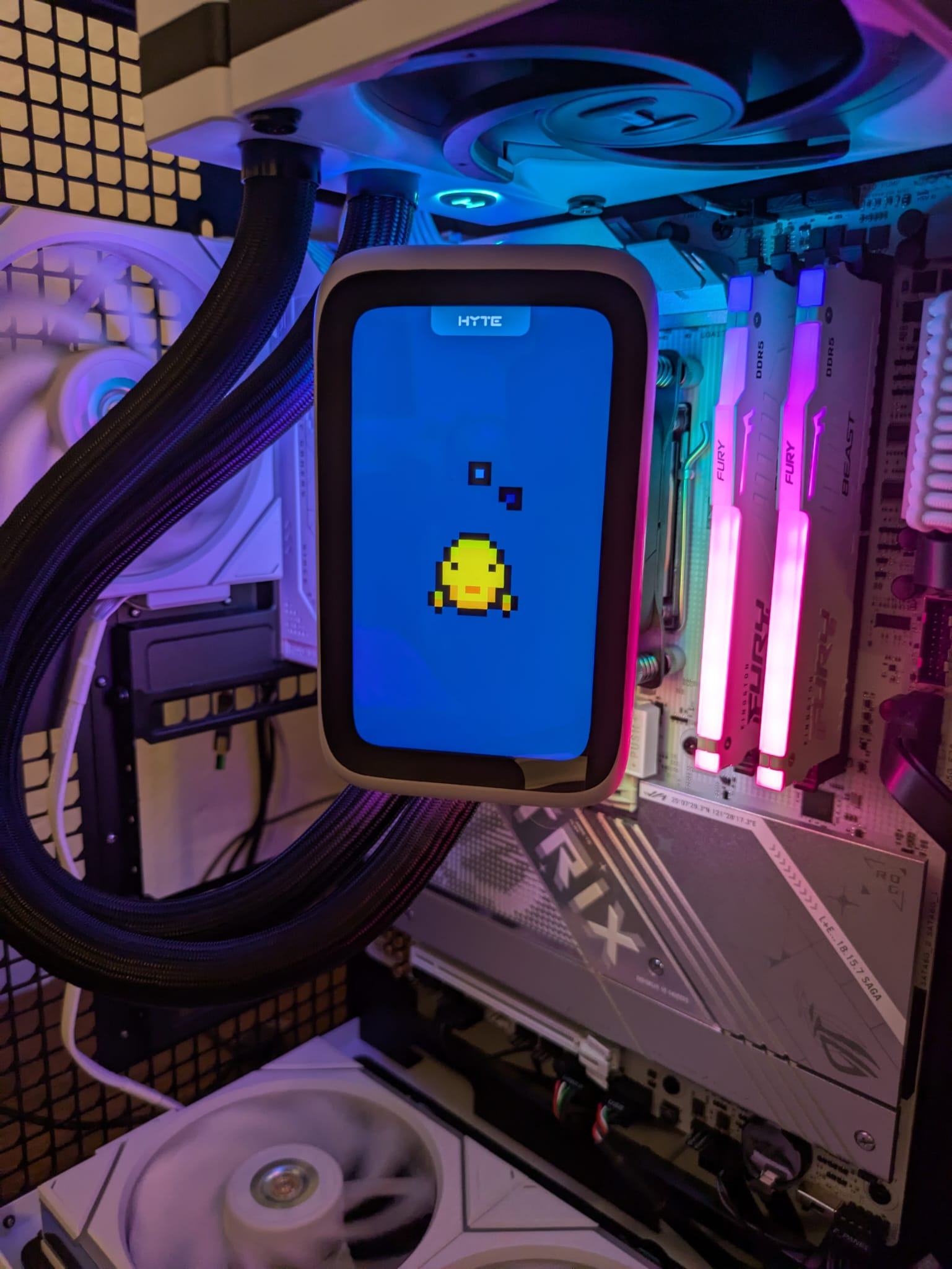 irgendwie hat Hyte es geschafft die Kabel vom Display gekonnt in der Halterung zu verstecken und es dann vom Kühlblock über einen der Wasserschläuche sauber und stramm unter den Sleeves eines Schlauches weiter zum Radiator zu führen.