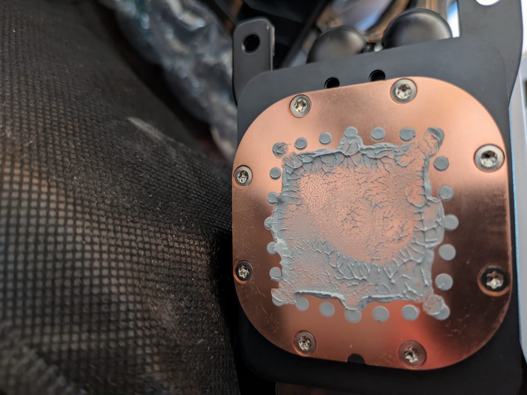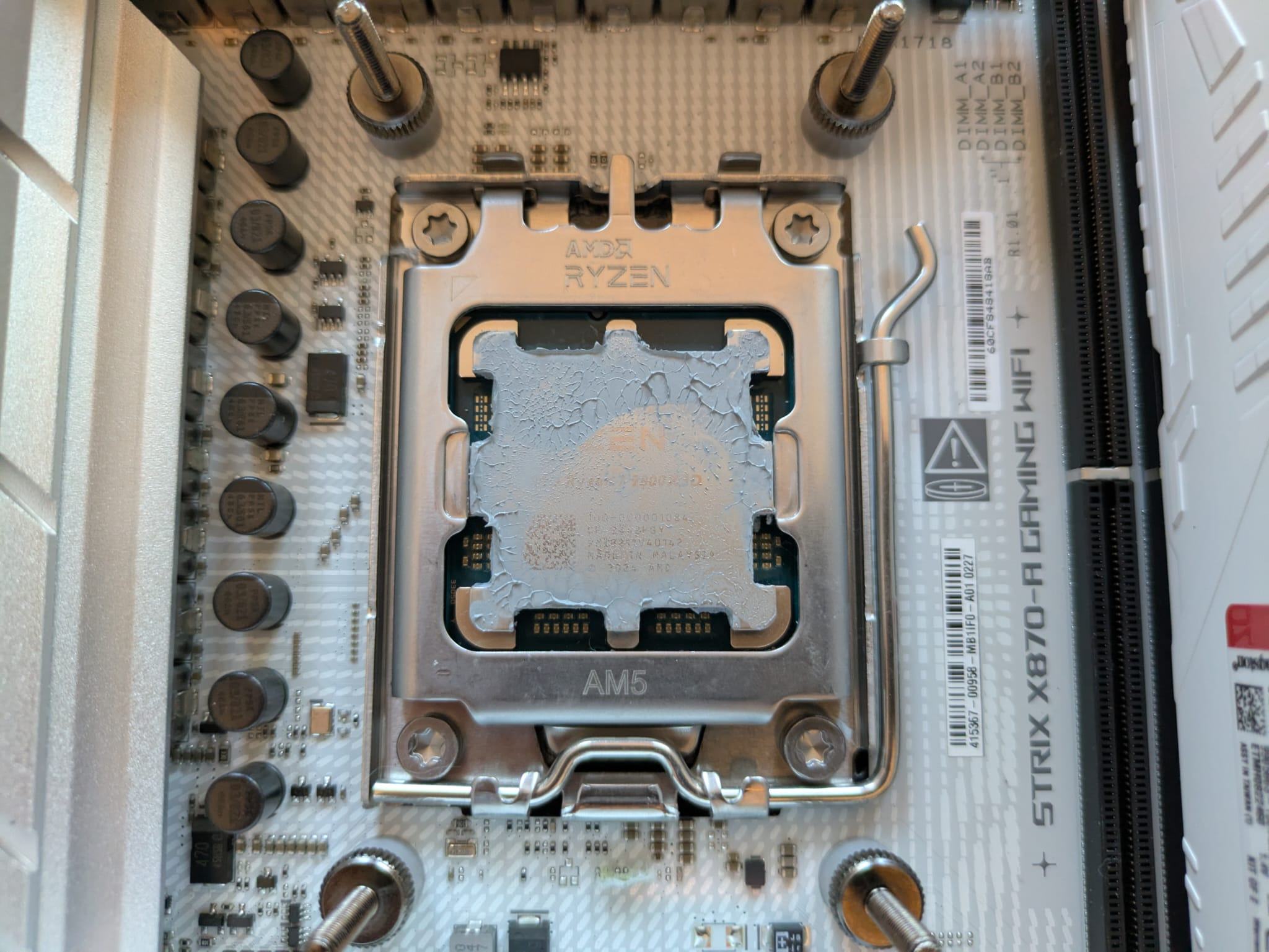aber sobald ich den Ryzen 9800X3D Stock belastet habe, ist die Temperatur sofort auf über 95°C gestiegen, da ich mir schon gedacht habe das irgendwas nicht mit dem kühler stimmt, habe ich den Kühlblock noch einmal abgeschraubt und siehe da, die Kühlerplatte lag nicht richtig auf dem Prozessor.
