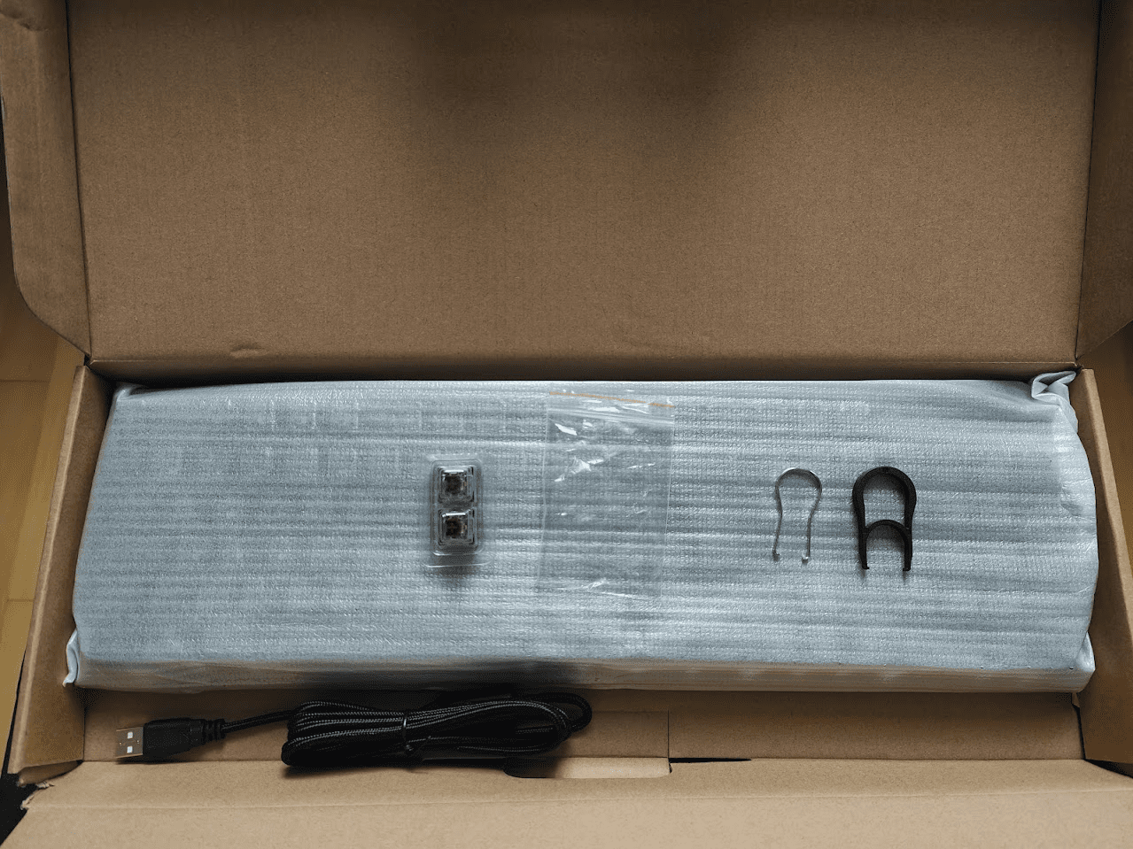 Das mitgelieferte USB-Kabel ist sehr locker gesleevt. Der Textilseeve wirkt zu groß für das Kabel und ist im Vergleich zum USB-Kabel der Tastaturen und den Kabeln des Headsets anders verarbeitet und umgesetzt. Das sorgt dafür, dass das USB-Kabel mehr Kontaktfläche auf dem Tisch hat und so subjektiv schlechter gleitet als andere, handelsübliche USB-Kabel.