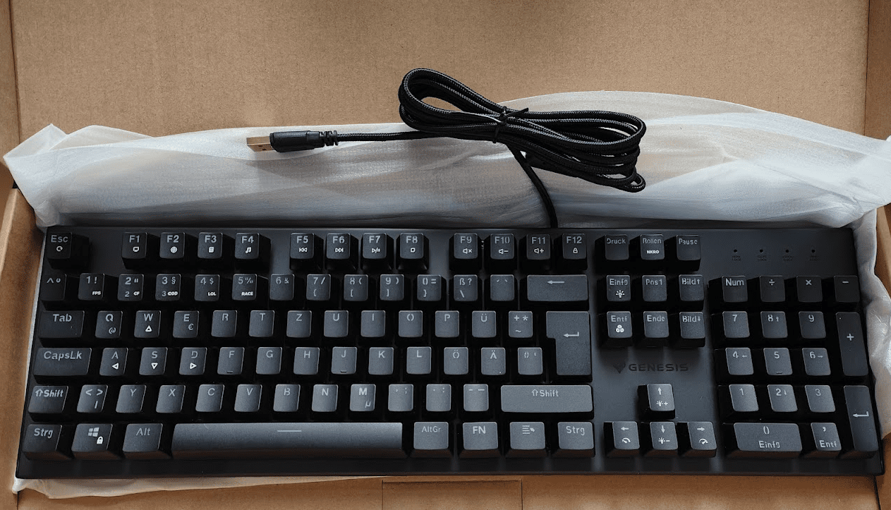 Die Thor 303 ist komplett in Schwarz gehalten. Seitlich ist sie komplett aus glänzendem Plastik, vorne und hinten ist jeweils die untere Hälfte des Gehäuses in glänzendem, schwarzen Plastik gehalten. Die gesamte Oberseite und die andere Hälfte der vorderen und hinteren Verkleidung ist aus matt schwarzem Aluminium. Es gibt links, rechts und hinten jeweils eine Öffnung um das, leider, fest montierte USB-A Kabel zu verlegen. Enttäuschenderweise hat Genesis auf eine abnehmbare Handballenauflage verzichtet, wie ich sie an meinen anderen Tastaturen sehr schätze.