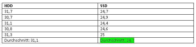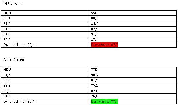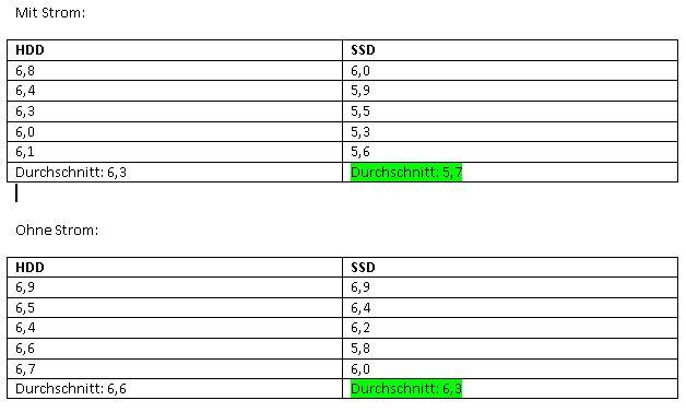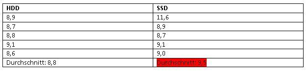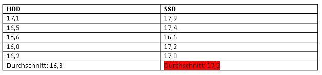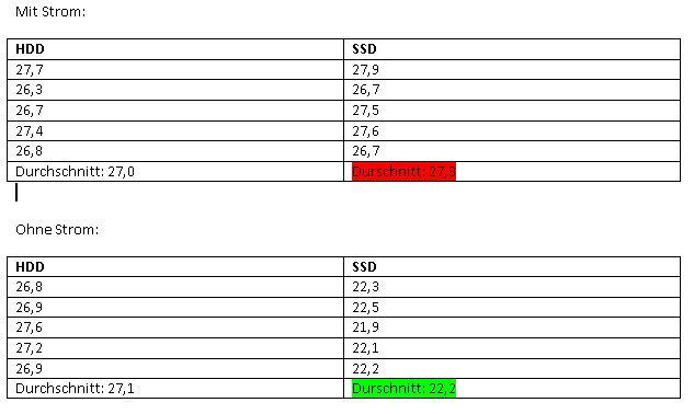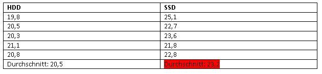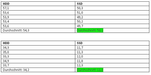 Es wurden jeweils 5 Messungen gemacht (manuell, mittels Stopuhr). Diese wurden in eine Tabelle eingetragen und dann wurde entsprechend der Wert der SSD grün (schneller) oder rot hinterlegt (langsamer). Auf die genauen Ergebnisse werde ich noch genauer eingehen.