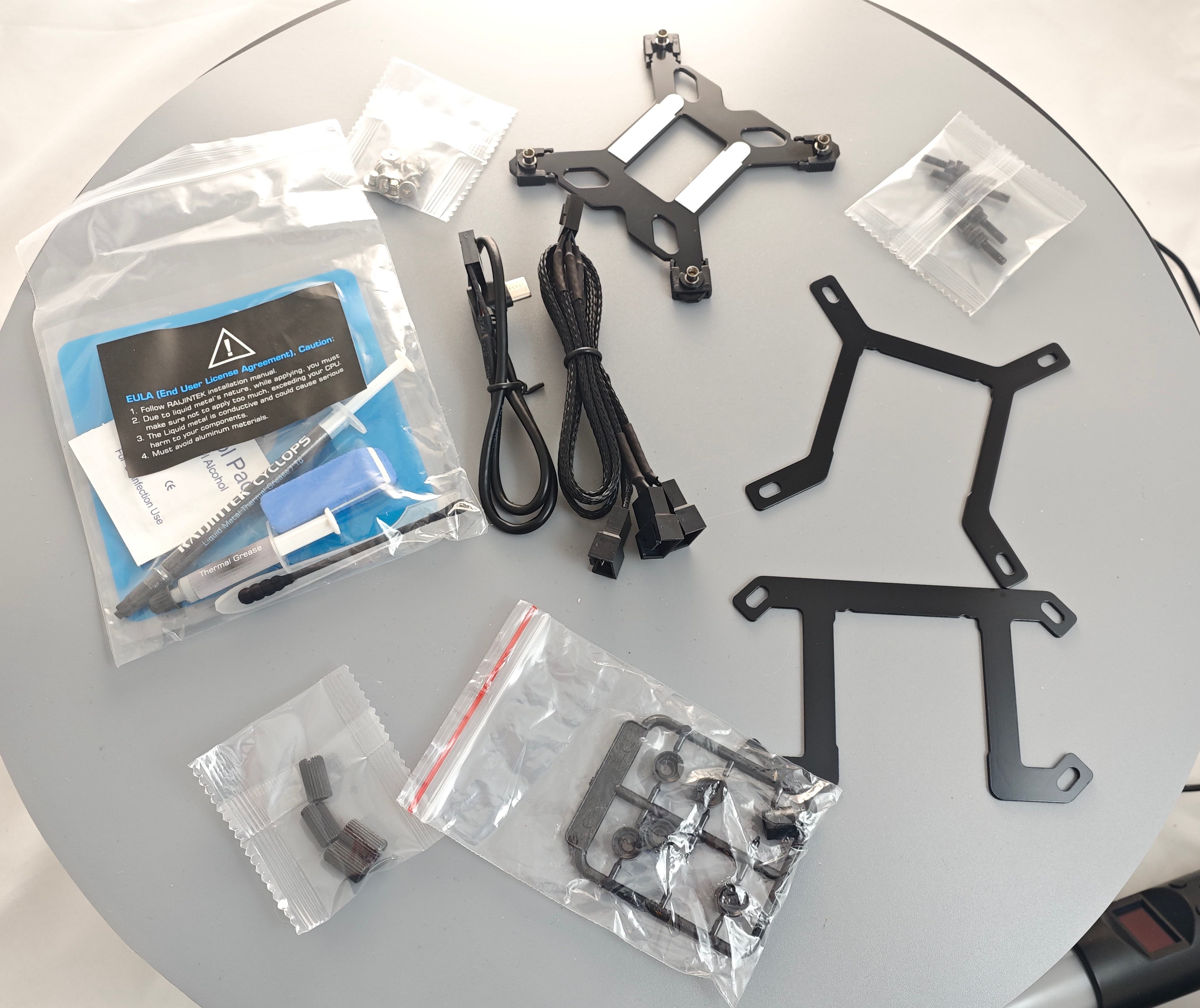 Es wird alles mitgeliefert was man für den Einbau, egal ob Intel- oder AMD-System (nur AM5), benötigt. Zusätzlich zum Liquid Metall wird auch noch eine Tube Wärmeleitpaste beigelegt.