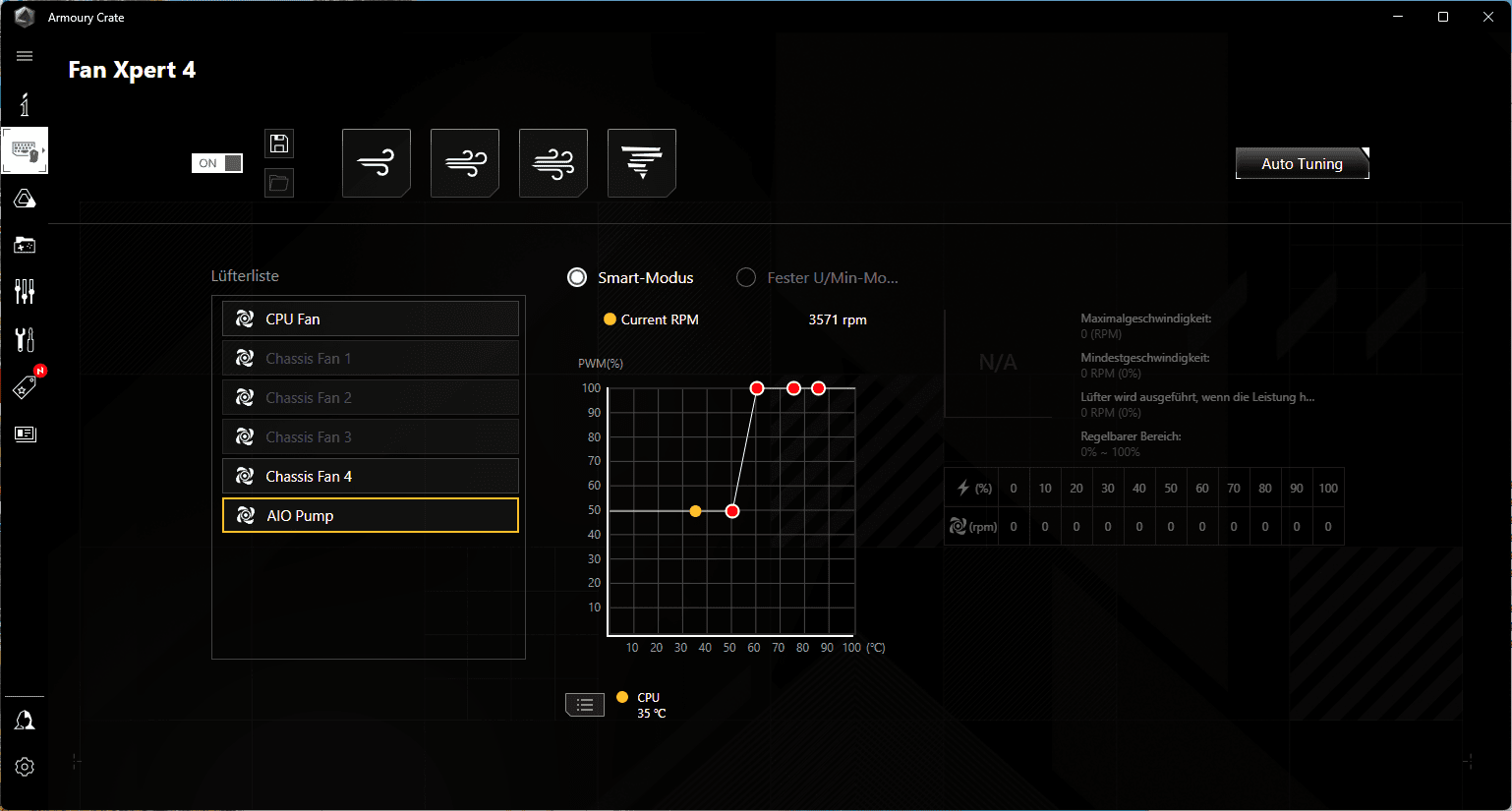 Für die Inbetriebnahme wurde Windows 11 installiert und über Asus Fan Xpert die Gehäuse und AiO Lüfter getestet.
