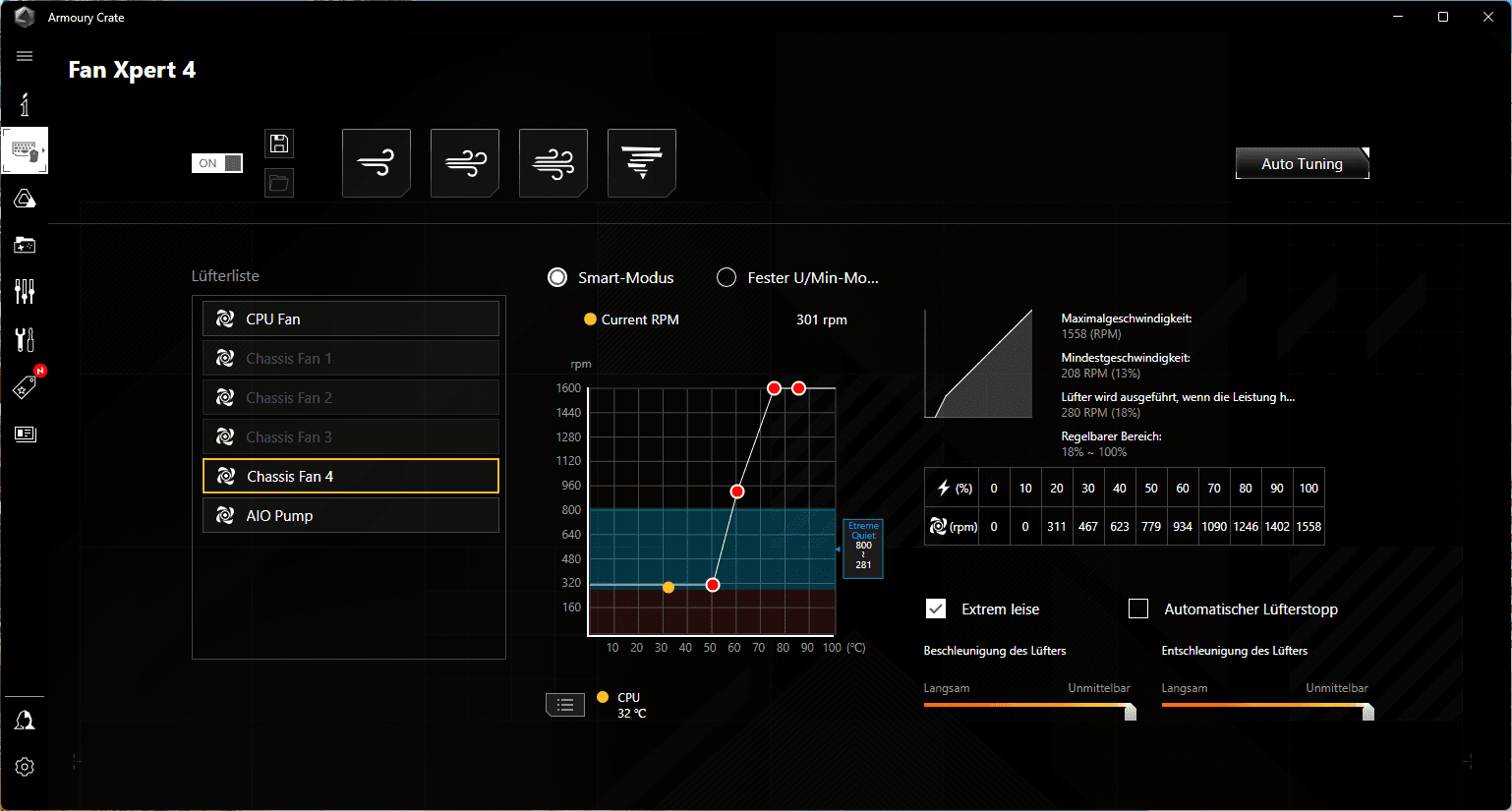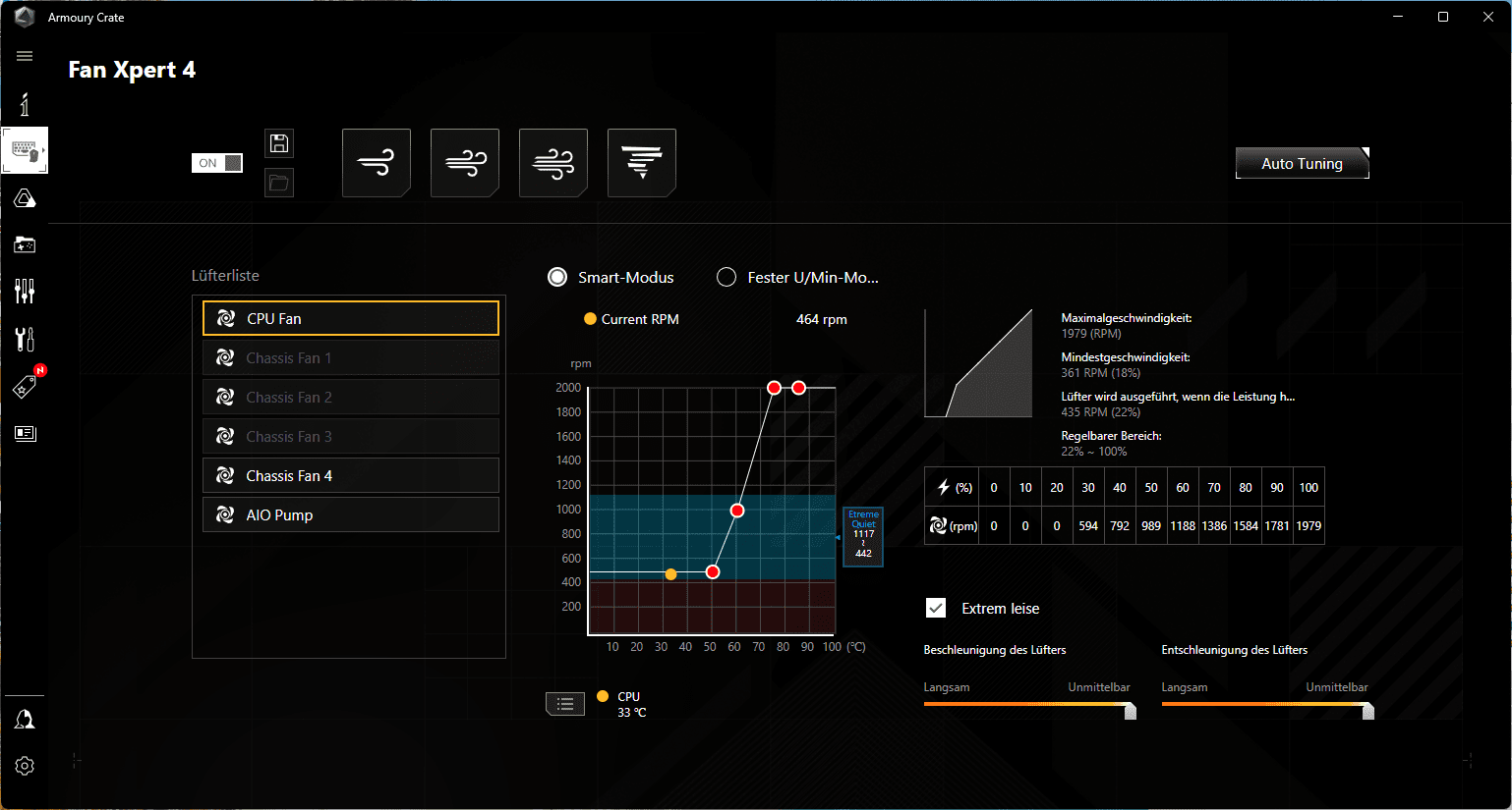 Lautstärke wird von jedem anders wahrgenommen, aber unterhalb von 500 RPM waren die Gehäuselüfter sehr zurückhaltend.
