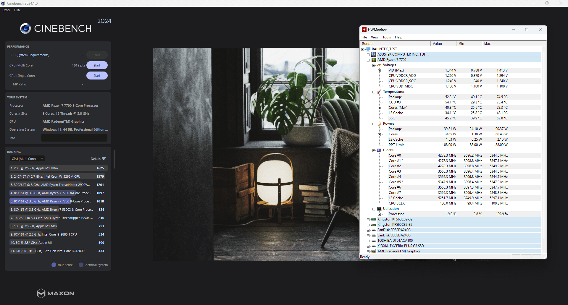 Dafür hab ich mit langsam drehenden Lüftern (Gehäuse 20% PWM und CPU 30% PWM) 3 Durchläufe von Cinebench 2024 laufen lassen.