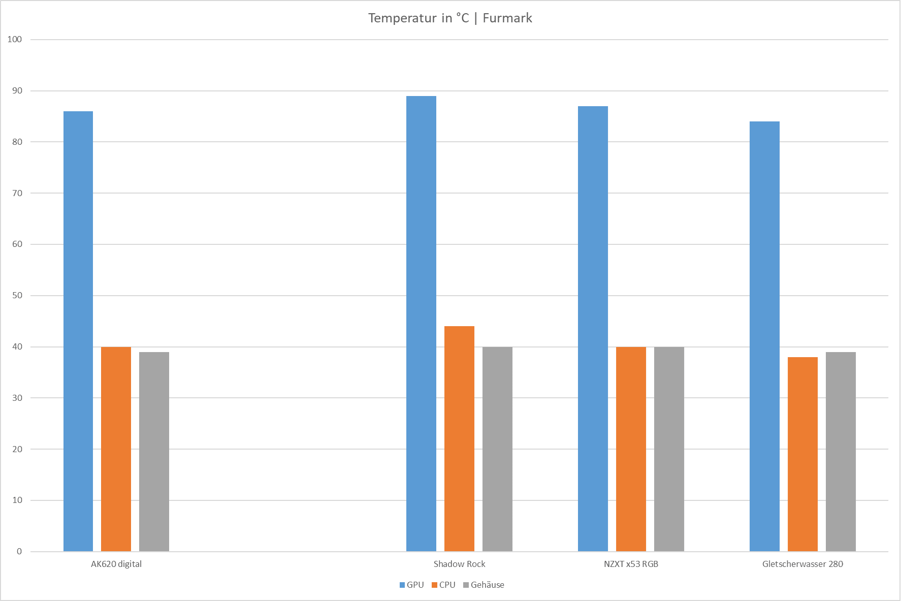 Um ein Gesamtbild der thermischen Fähigkeiten des CPU-Kühlers aufzuzeigen, habe ich diverse Lastszenarien geprüft. Neben dem Idle wurde auch Cinebench, Prime 95 und Furmark genutzt.
