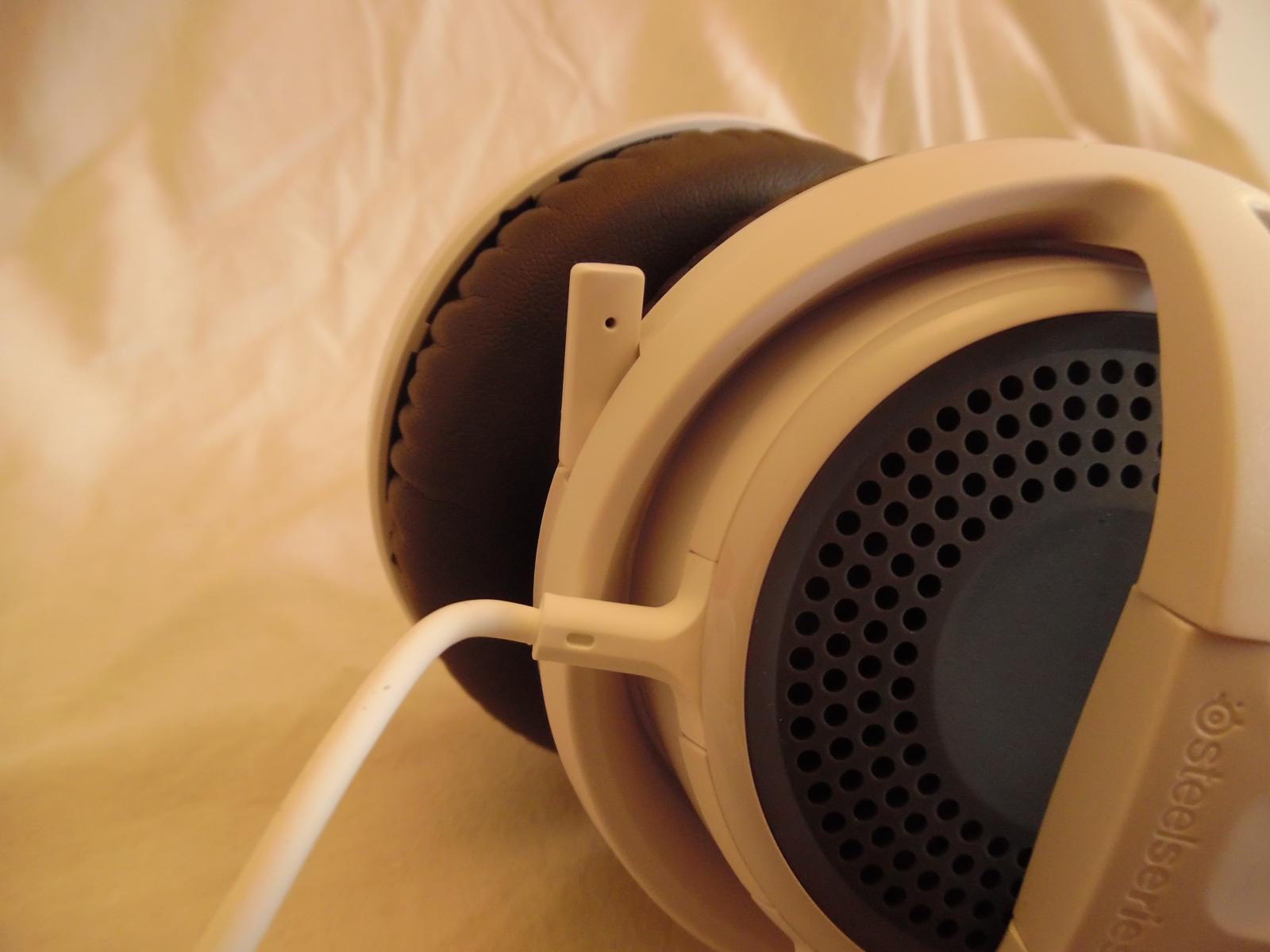 Die Polsterung der Hörmuschel ist Ohrumschließend ausgelegt und mit Polstern aus extrem angenehmen Memoryschaum versehen. Und hier muss man der Designabteilung von Steelseries ein riesen Lob aussprechen. Wo bei vielen anderen Headsets nach ein paar Stunden Tragezeit der Kopfhörer hier und da schmerzhafte Druckstellen verursacht schafft das Siberia v3 vergessen zu machen das man überhaupt ein Headset trägt. Ein weiterer Vorteil der Polsterung ist, dass sie tatsächlich extrem Aussenschallreduzierend wirkt. Ja man könnte das Headset wohl schon fast als Hörschutz tragen. Allerdings ergibt sich, zumindest gefühlt, daraus scheinbar auch ein Nachteil. Durch die "abdichtende" Wirkung des Ohrpolsters hatte ich hin und wieder das Gefühl als würde der beim Aufsetzen entstehende Luftdruck die Lautsprechermembran nach außen drücken. Dies machte sich durch ein Knistern wie man es von Fruchtgummitüten kennt bemerkbar. Ich hoffe einfach das dies der Haltbarkeit des Headsets nicht schadet. Das Mikrofon ist flexibel gestaltet was eine optimale Positionierung sehr einfach macht. Hier erweckt es auch nicht den Anschein als würde das Anpassen auf Dauer dem Kabel schaden könne. Die Anschlusskabel sind nicht zu dick oder dünn und haben die angenehme Angewohnheit nicht zu verheddern. Außerdem sind sie in ein sehr angenehm zu greifendes Gummigemisch gehüllt.