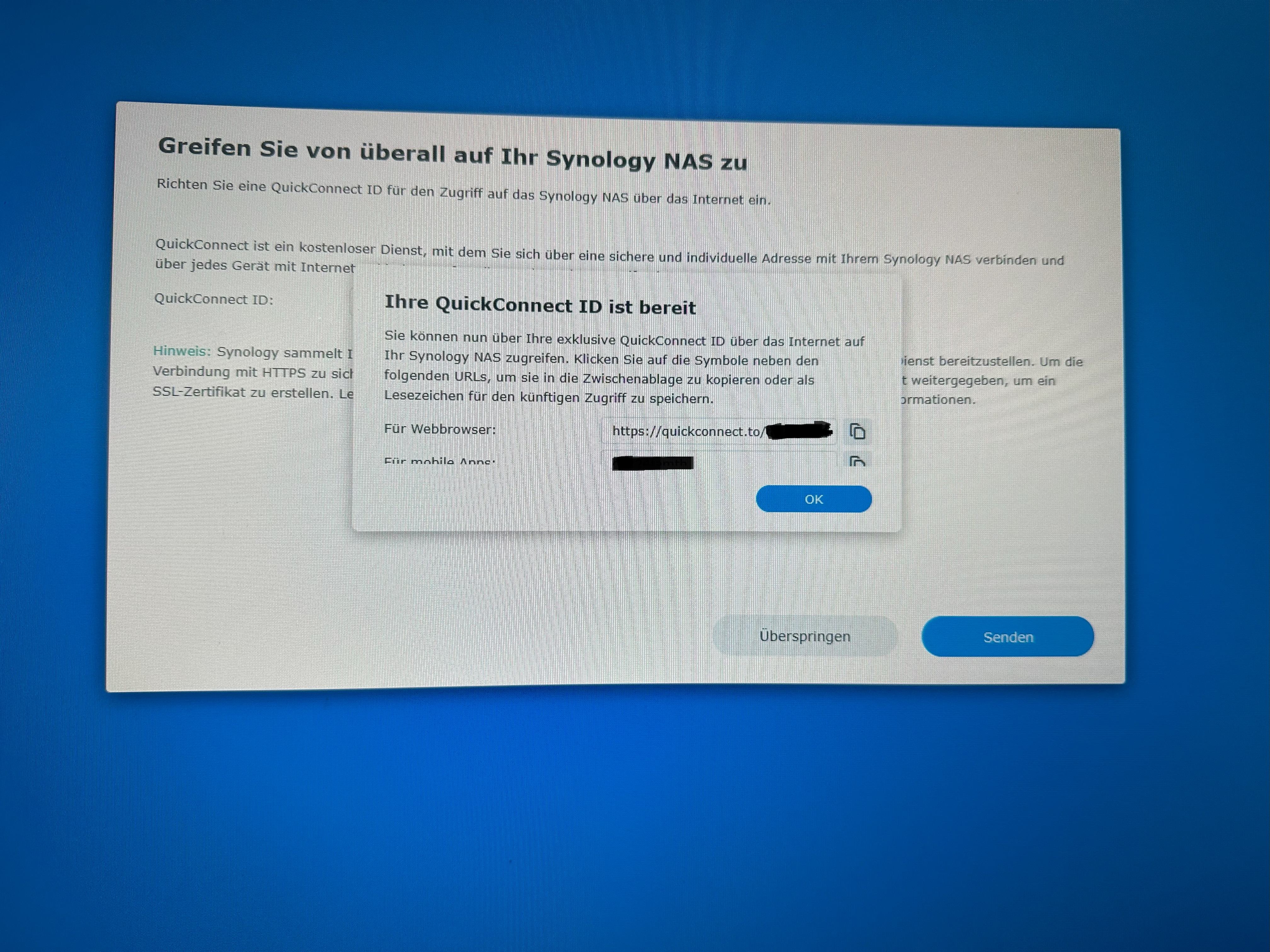 Haben wir nun unser Quick Connect ID vergeben, senden wir unsere Daten an Synology, bevor wir dann zur nächsten Seite weiter geleitet werden, wird uns eine Bestätigung in Form eines PopUps eingeblendet, hier werden dann alle nötigen Informationen angezeigt. (Ich musste gewisse Bereiche in diesem Fall schwärzen, da es hier natürlich auch um Private Daten handelt)
