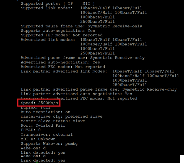 Anschließend habe ich einen meiner Server-Rechner, der ebenfalls eine 2,5G LAN-Buchse hat, angeschlossen und auch über Linux funktioniert das 2,5G sofort. Mit ethtool und dem Adapter prüfe ich auch auf dem Linux-Rechner die Geschwindigkeit und es sind 2,5G wie erwartet: