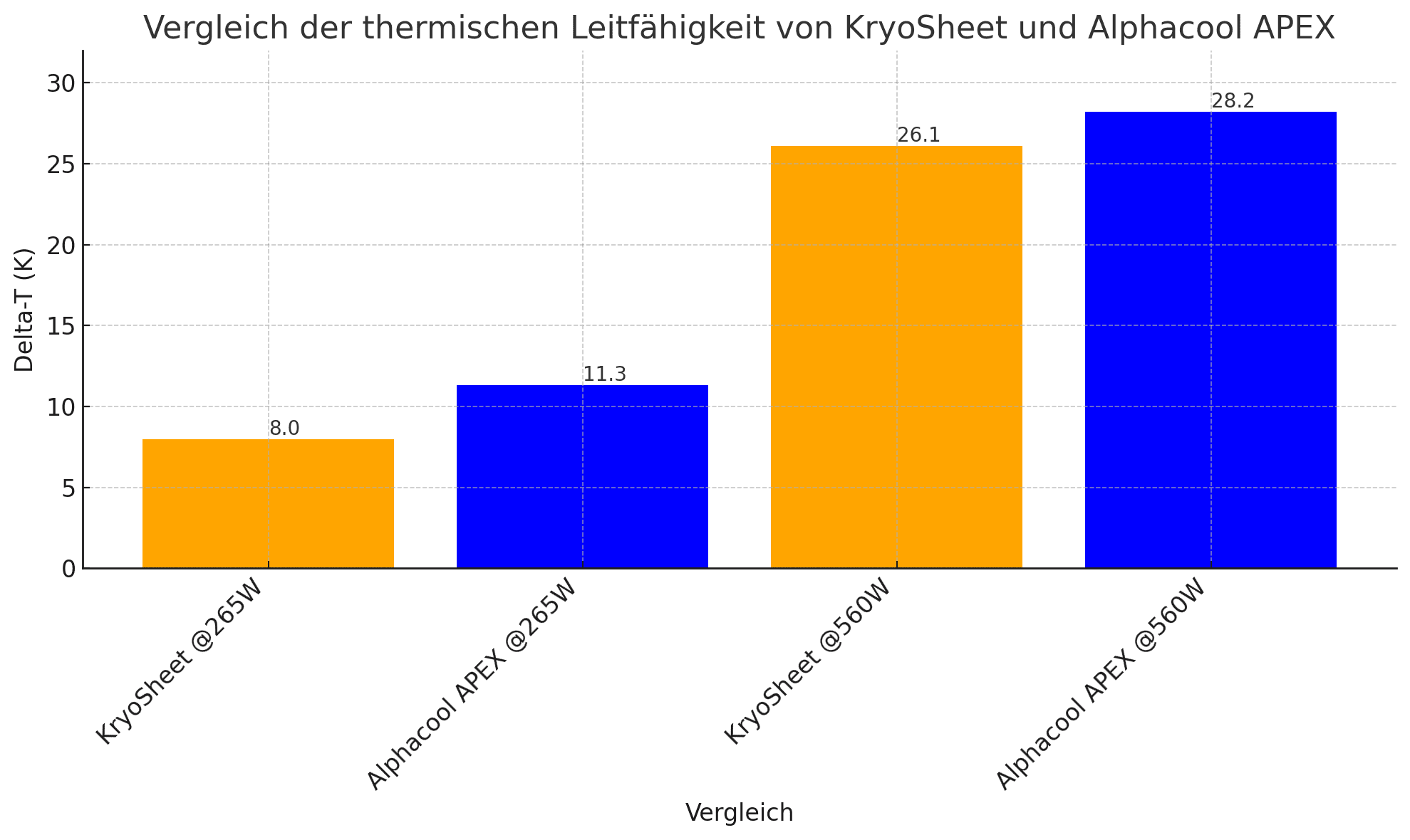Das Kryosheet liefert bei beiden Testoption mehr Leistung bzw. Thermische Übertragung als die Alphacool APEX.