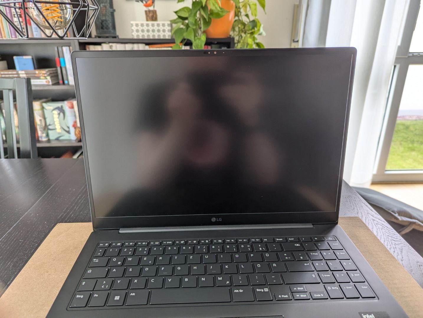 Leicht. Beim ersten hochheben des LG gram 16 pro fällt sofort das niedrige Gewicht auf. Die Oberfläche ist schwarz, leicht rau, dennoch glatt. Und… ach shit, der erste Fingerabdruck. Ähnlich wie ich es von Lenovo-Geräten kenne, sind diese sehr dunklen und leicht rauen Oberflächen perfekte Magneten für Fingerabdrücke, welche praktisch ab dem ersten Kontakt zwangsweise hier und da auf dem Gerät bleiben. Dies möchte ich direkt klar hervorheben, da man sich dessen bewusst sein muss. Anfangs habe ich noch versucht Fingerabdrücke immer wieder zu entfernen, jedoch nach den ersten Tagen hatte ich einfach keine Lust mehr permanent mit einem Mikrofaser-Tuch hinterher zu wischen. Nicht bei einem Arbeitsgerät, was das LG gram 16 pro sein möchte. Dies führt natürlich irgendwann zwangsweise dazu, dass das Gerät fleckig aussieht.