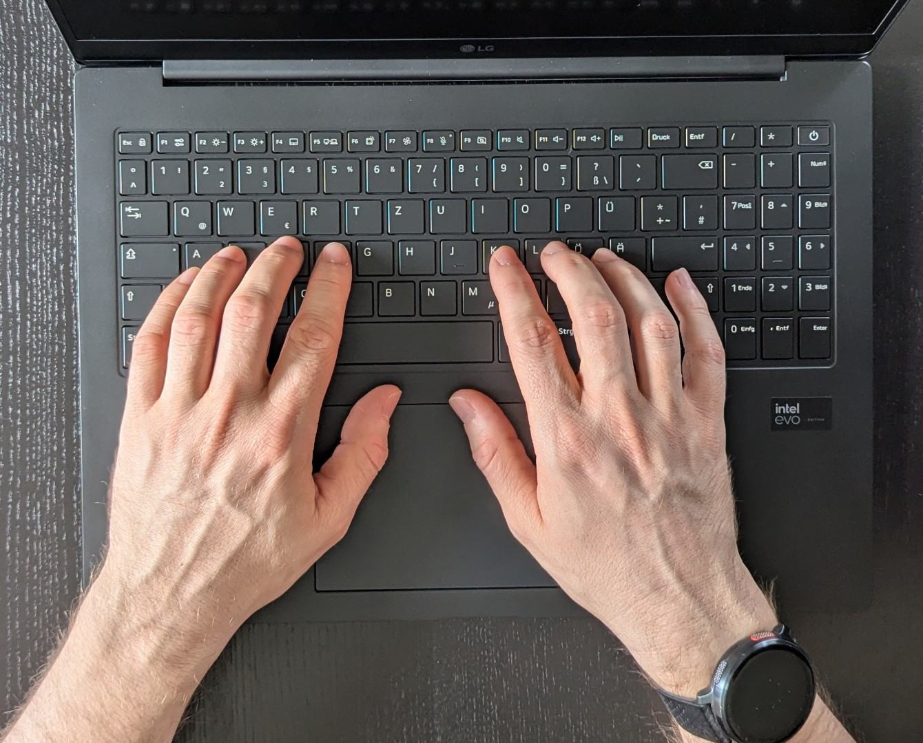Das die Tasten des LG gram 16 pro komplett eben sind, ist ebenfalls ein Kritikpunkt, welcher sich aktuell viele Laptops teilen. Leicht geschwungene Tasten, so wie bei der Business-Serie von Lenono-Laptops beispielsweise, erzeugen ein sicheres Tippgefühl, da die Fingerkuppen ein besseres Gefühl dafür bekommen, wo man sich aktuell auf der Taste befindet. Für mich als Software-Entwickler, welcher täglich tausende Mal in die Tasten hämmert, ist dies essenziell um schnell und effizient zu arbeiten. Auch überzeugt mich das Tastaturlayout nur bedingt. Zum einen gefällt ich die Breite der Tasten nicht. Insgesamt sind für mich die Wege zwischen den Tasten zu groß, so dass ich das Gefühl habe meine Handgelenke zu weit überstrecken zu müssen. Dies führt zu einem insgesamt unangenehmen Gefühl. Die Position der „#“-Taste halte ich für einen schlechten Witz (siehe Foto).